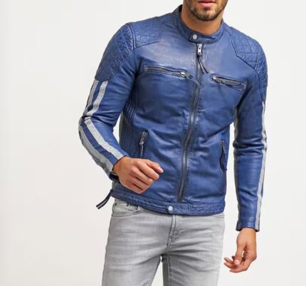 Men’s Blue Cafe Racer Motorcycle Leather Jacket