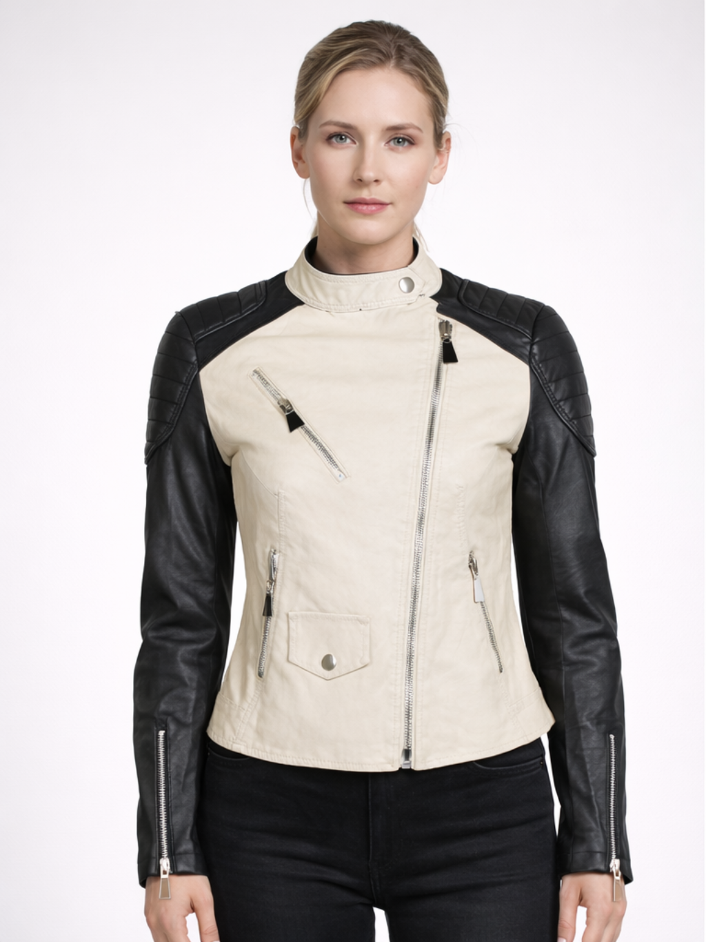 Be the first to review “Black Arm White Leather Women Biker Jacket”