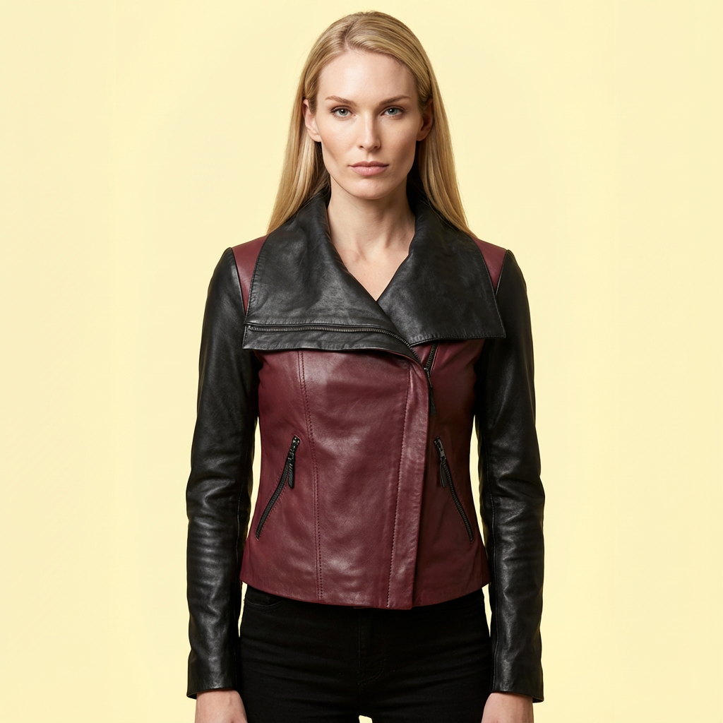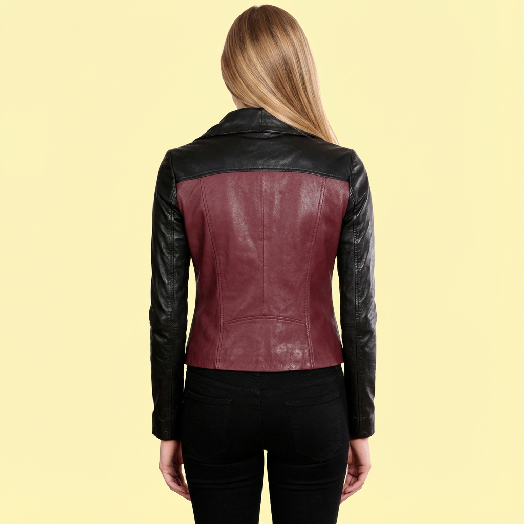 The Burgundy & Black Fashion Cum Moto Leather Jacket for Women from American Leather Jackets is a stunning blend of biker attitude and modern fashion. Designed for women who love a unique, stylish biker jacket, this dual-tone piece makes a bold statement while maintaining a refined, elegant look.