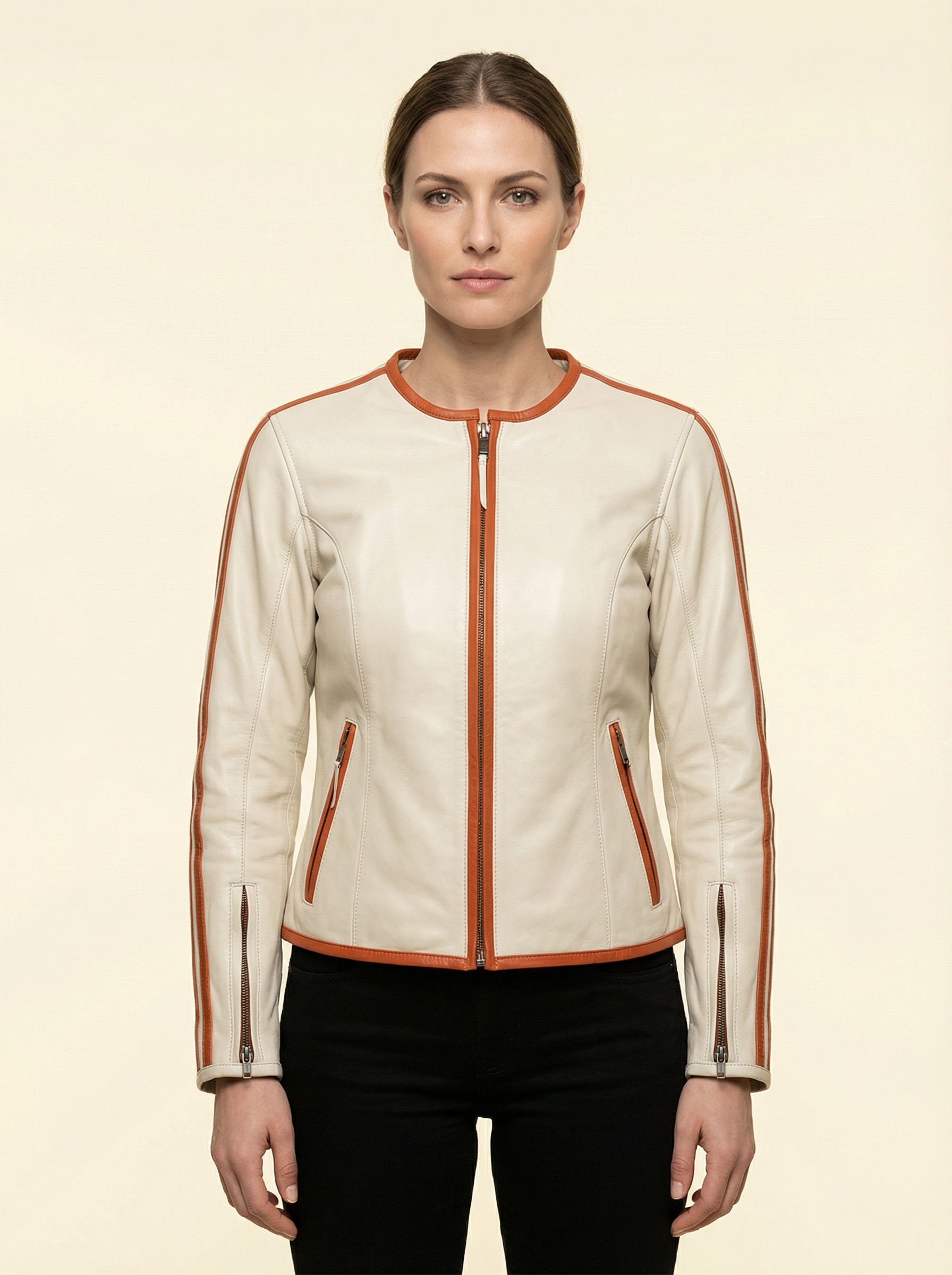 Stand out on and off the road with this burgundy-striped white biker jacket for women, designed for durability, comfort, and bold style. Crafted from drum-dyed genuine cowhide leather (1.1–1.2 mm thickness), this women’s motorcycle leather jacket offers excellent abrasion resistance and a premium, long-lasting finish.