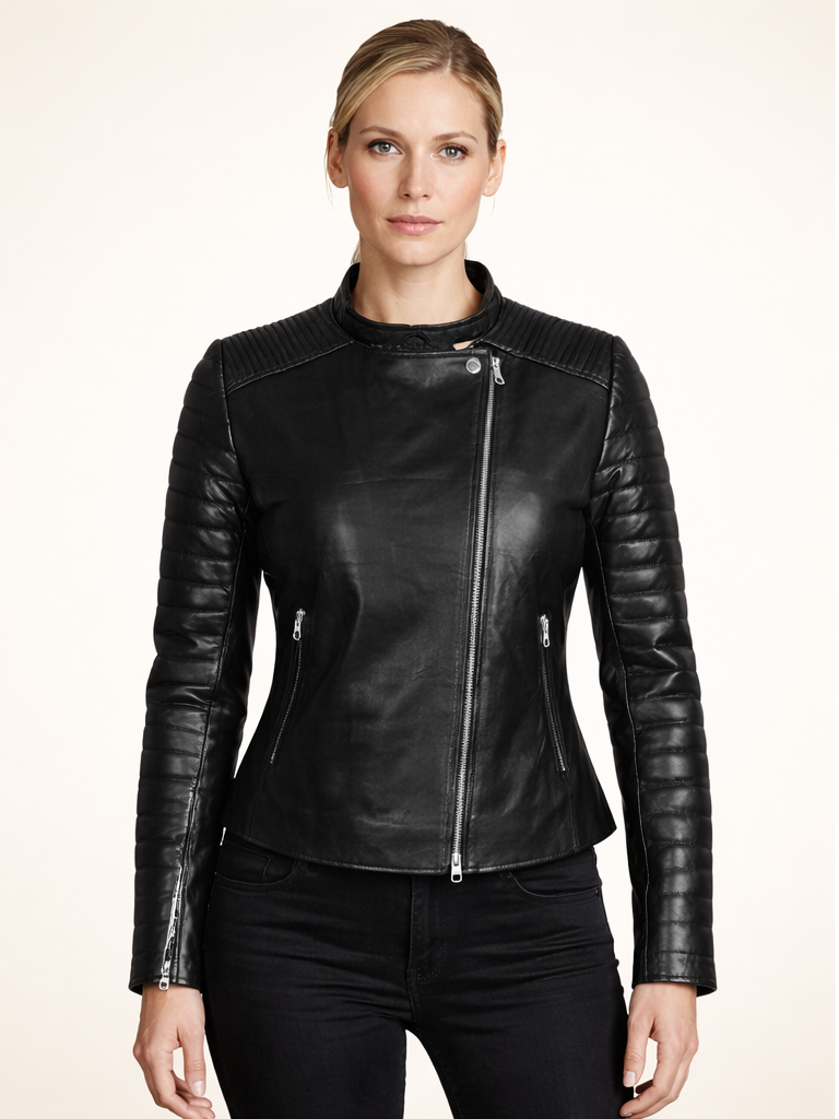The jacket features quilted shoulders and arms, adding both visual appeal and enhanced comfort. Zippered sleeves provide an adjustable fit, while two zippered waist pockets offer secure storage for everyday essentials. The collarless design gives this black leather jacket for women a clean, contemporary silhouette ideal for riding or casual wear.