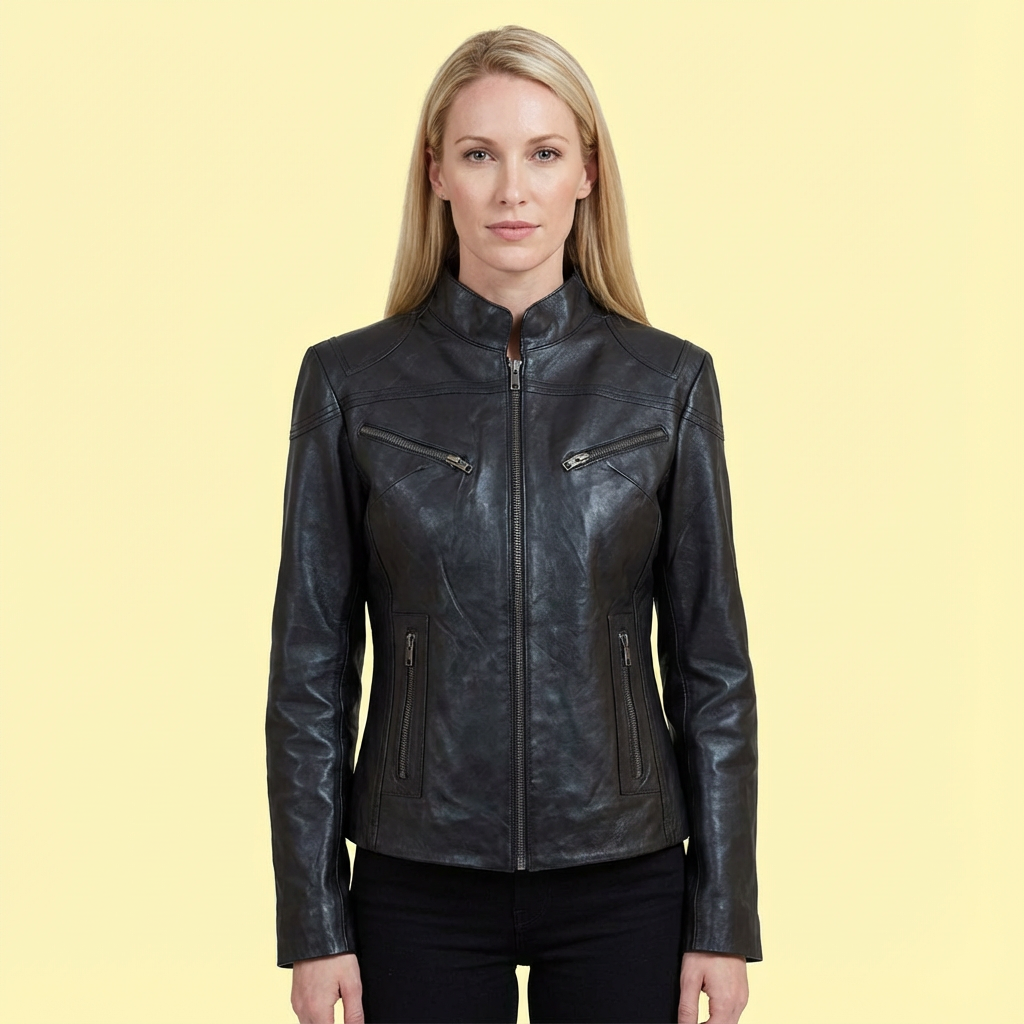 This women’s leather biker jacket features a classic stand-up collar, a heavy-duty front zipper, and a sleek silhouette that blends timeless biker style with modern functionality. Whether you’re riding or styling it casually, this jacket delivers premium quality and protection.