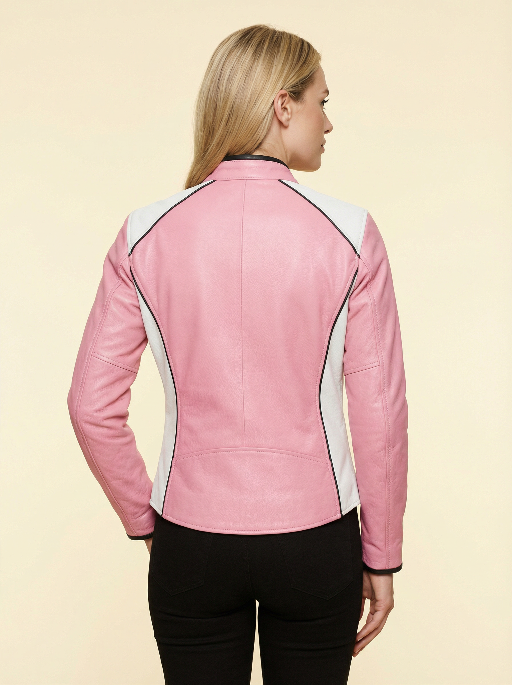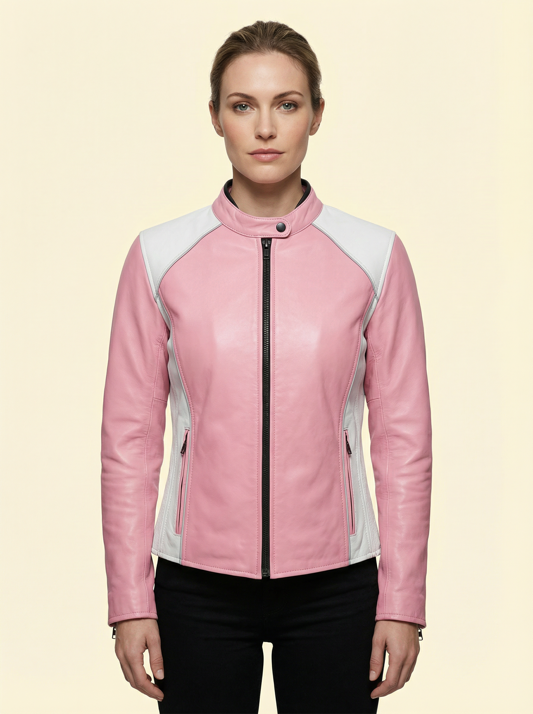 Ride in style with this women’s pink and white motorcycle leather jacket, crafted from drum-dyed genuine cowhide leather (1.1–1.2 mm) for durability, comfort, and a premium finish. Designed for both fashion and functionality, this jacket features two zippered outer pockets for secure storage of your essentials.