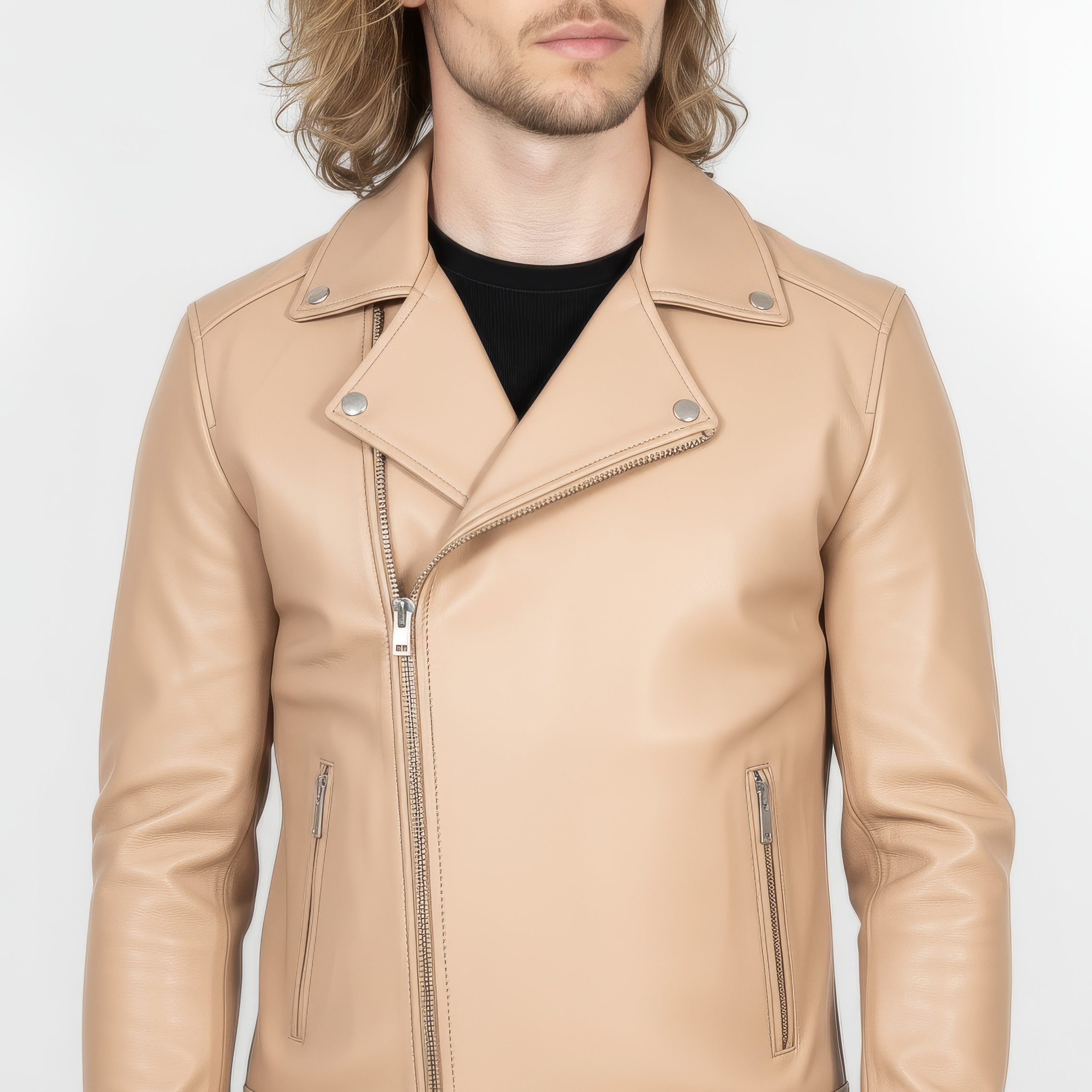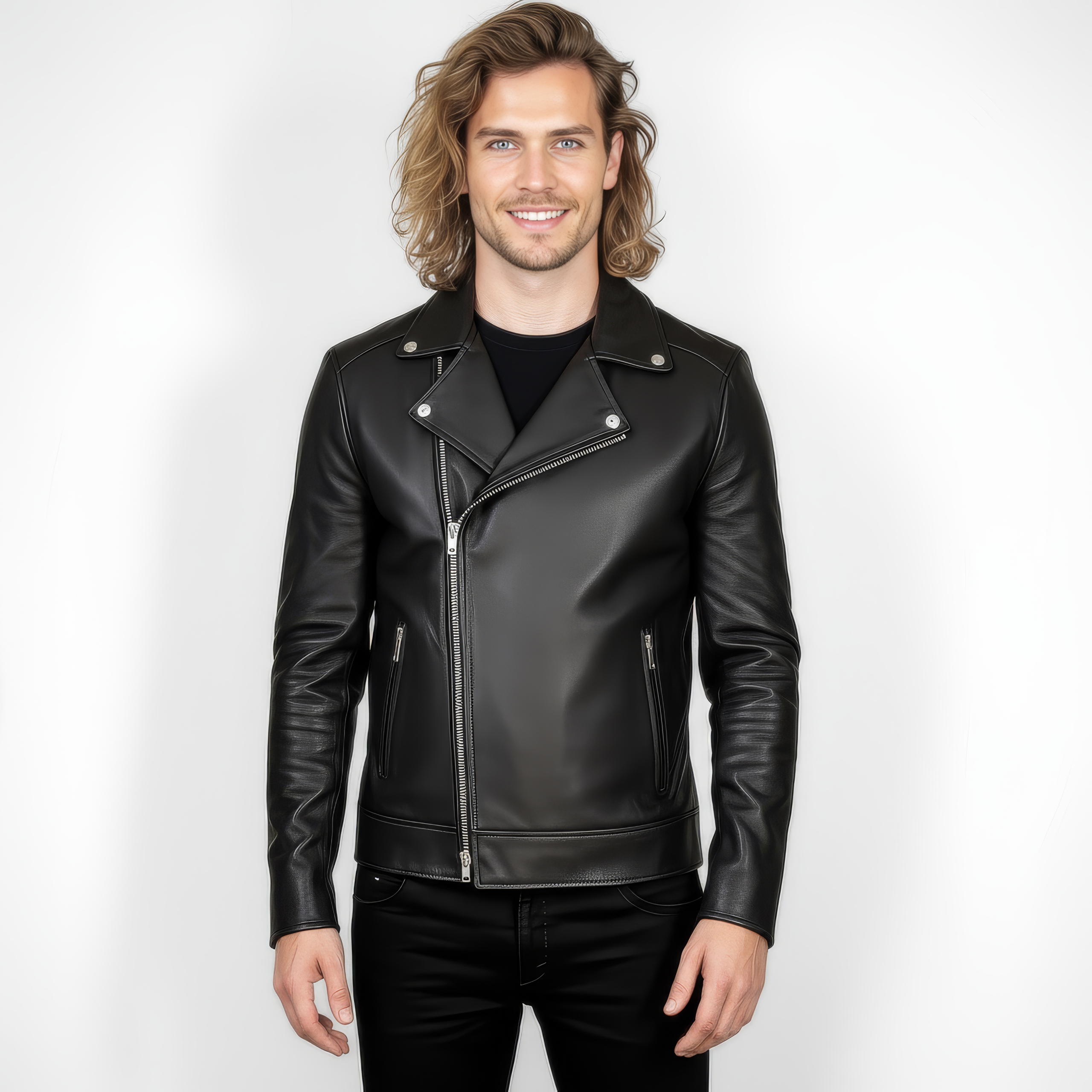 A clean, modern take on the moto: sharp snap-down lapels, asymmetric front zip, and a trim profile with paneled back that stays sleek while you move.