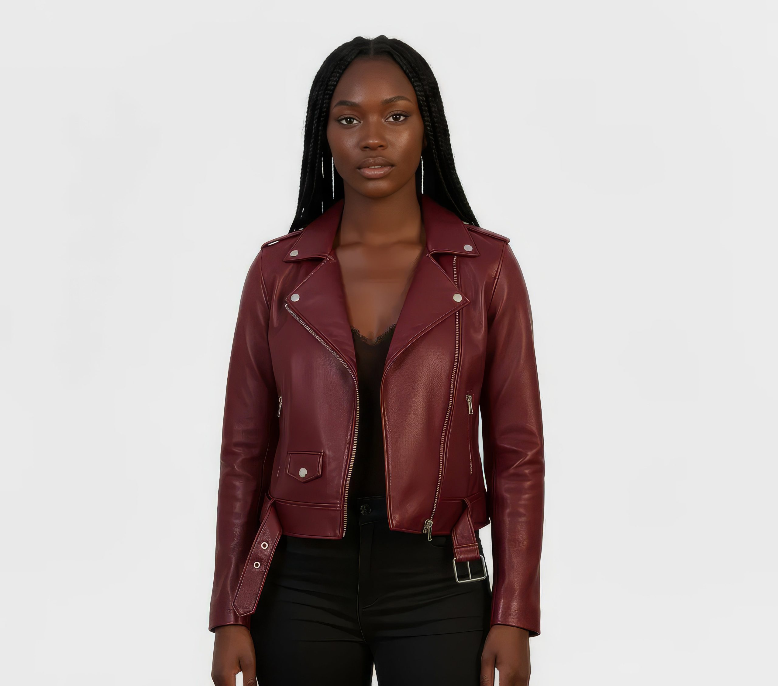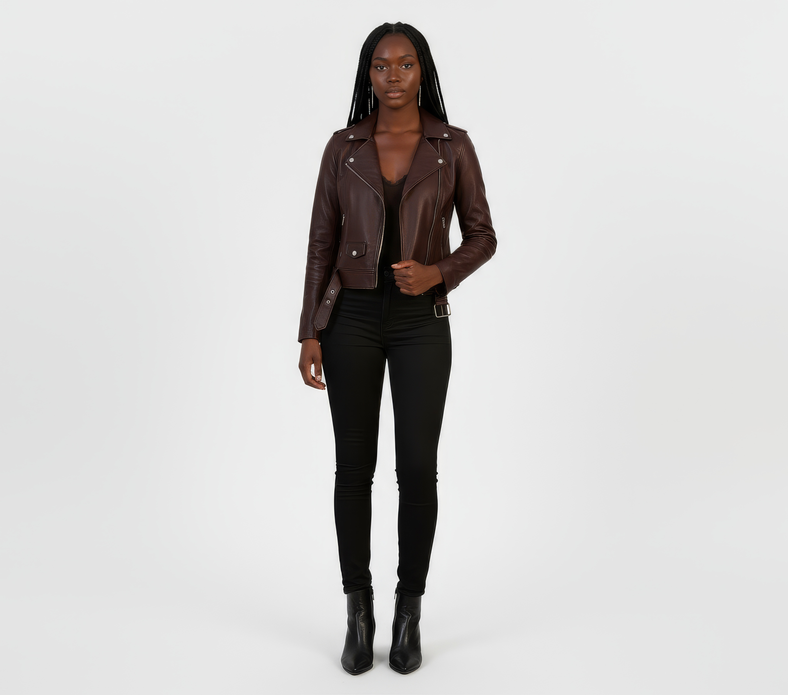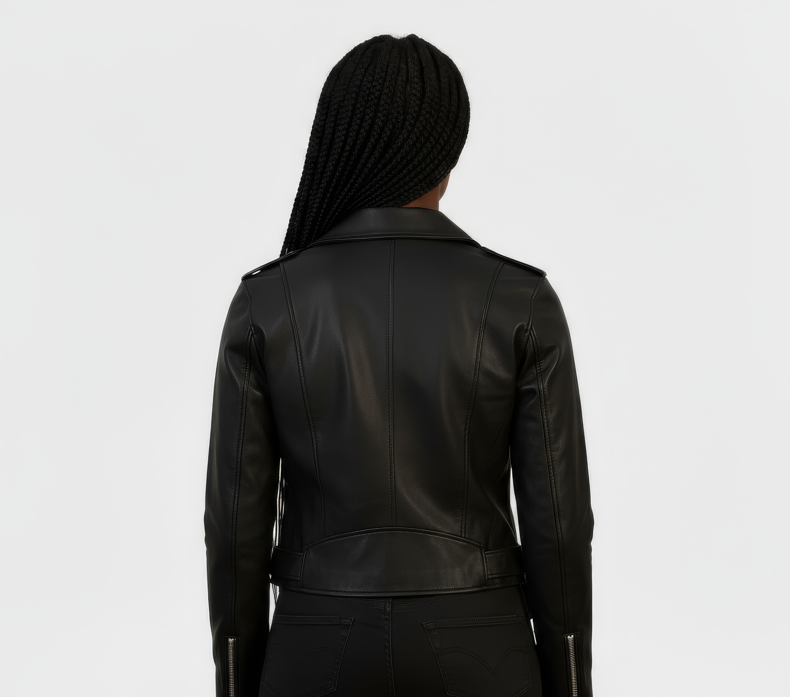 A sharp, waist-defining moto cut with classic notch lapels, an asymmetrical front zip, and a clean belt set at the hem. Tailored from full-grain lambskin (the top 5% of hides worldwide) for a supple hand and long-wear durability.