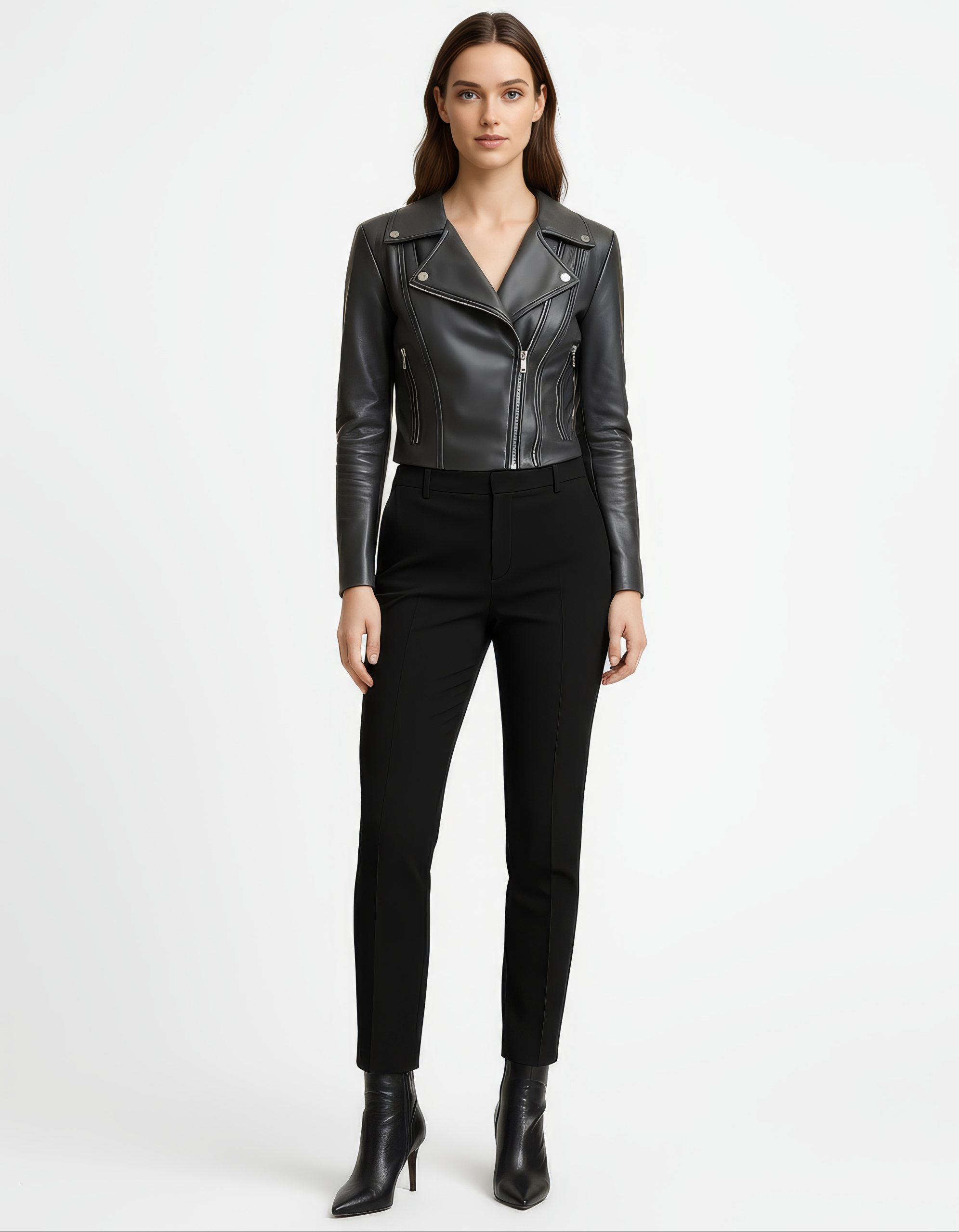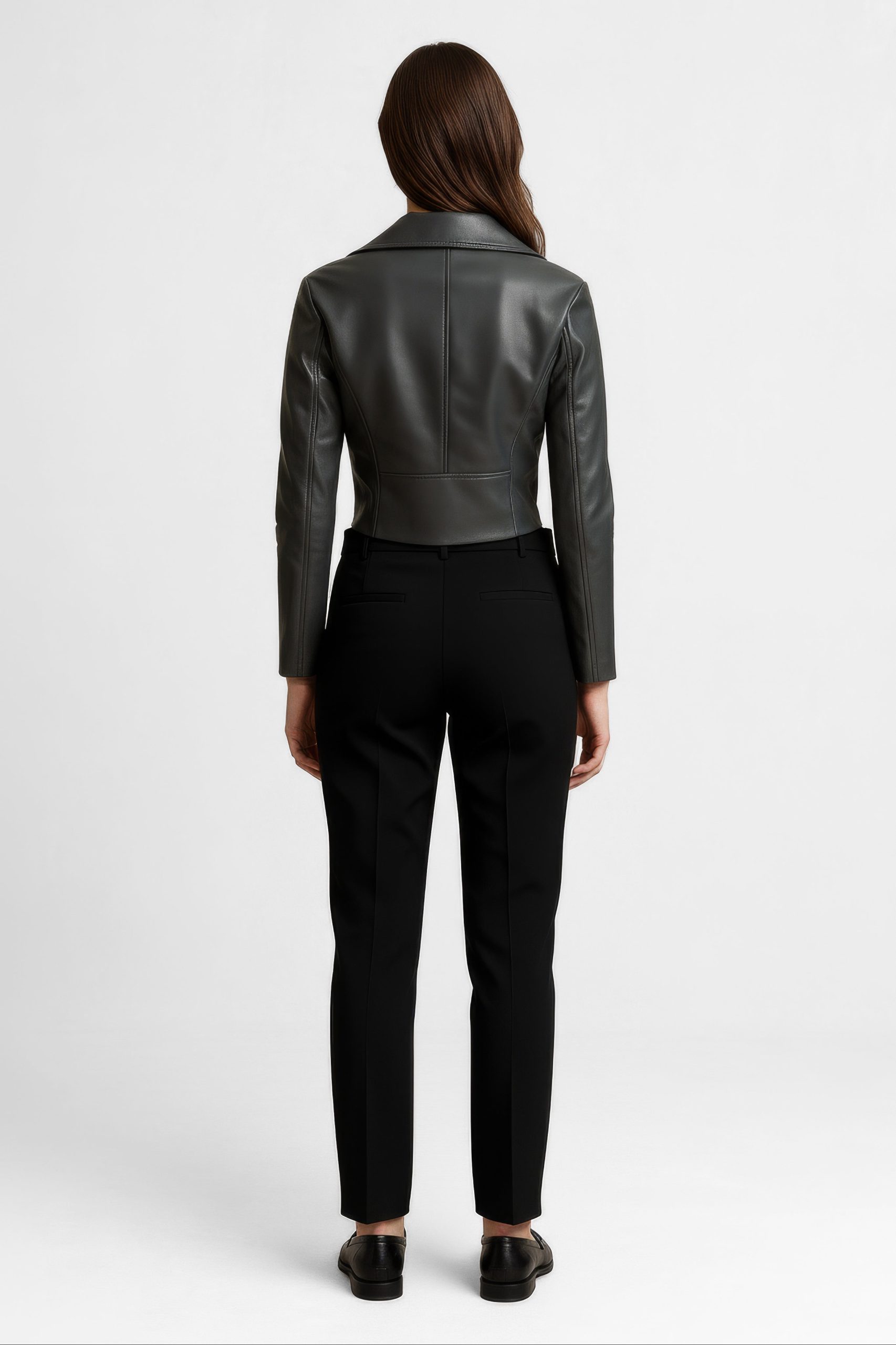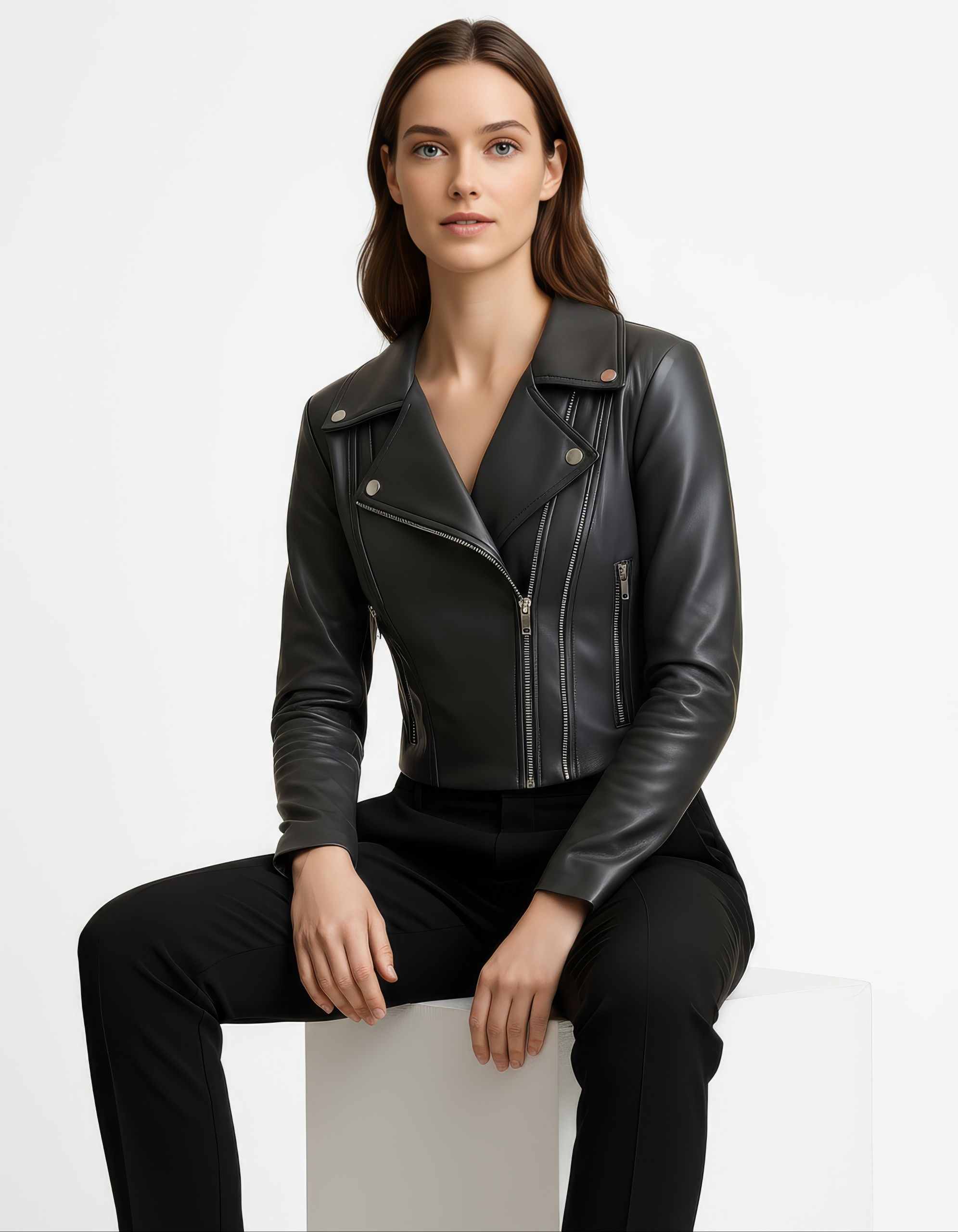 A sharp, sculpted take on the biker, this cropped jacket features clean lines, restrained hardware, and precision seaming that contours the waist for a refined, feminine profile. Crafted from full-grain leather selected from the top 5% worldwide to balance softness with structure for everyday wear and evening polish.
