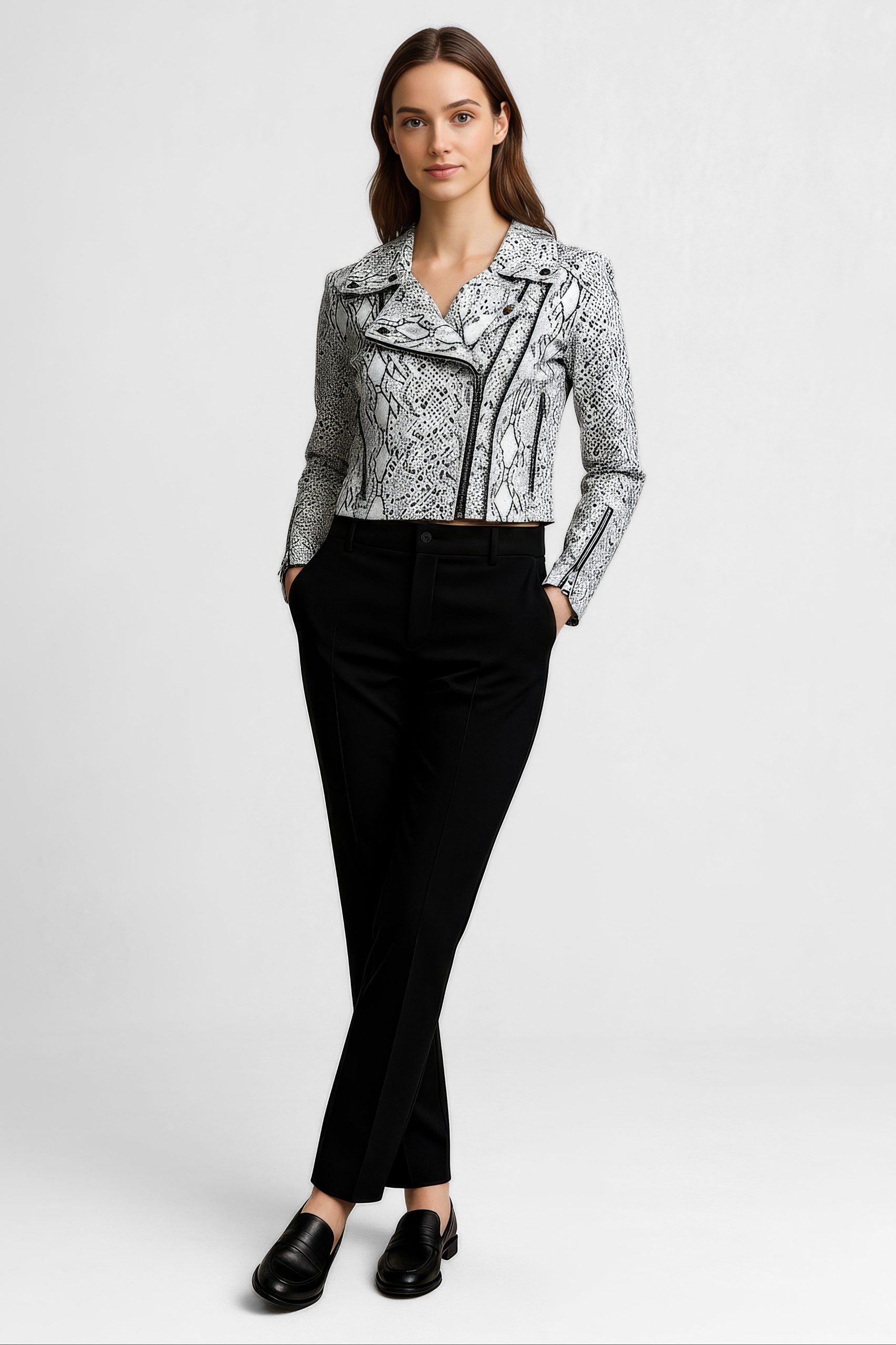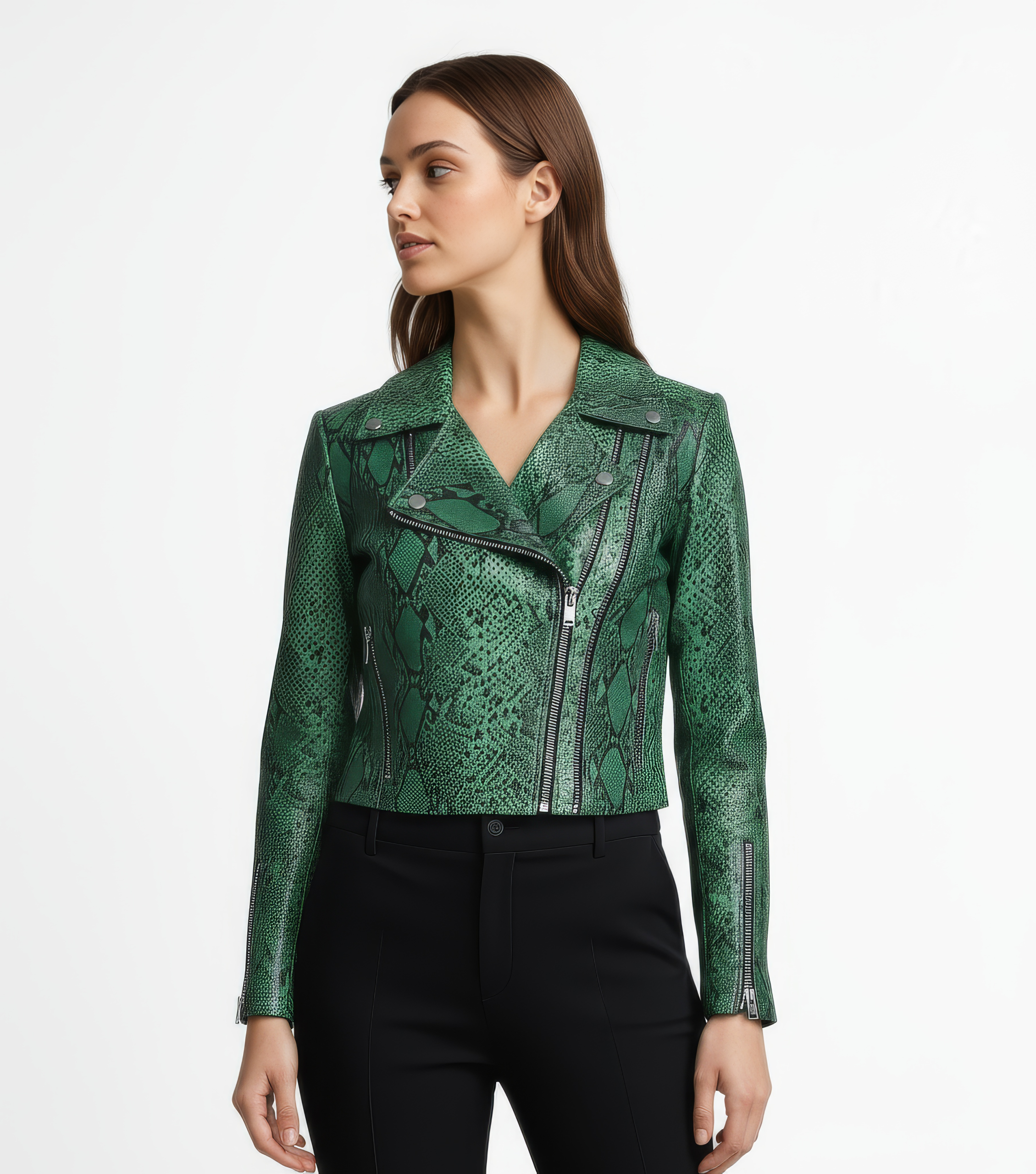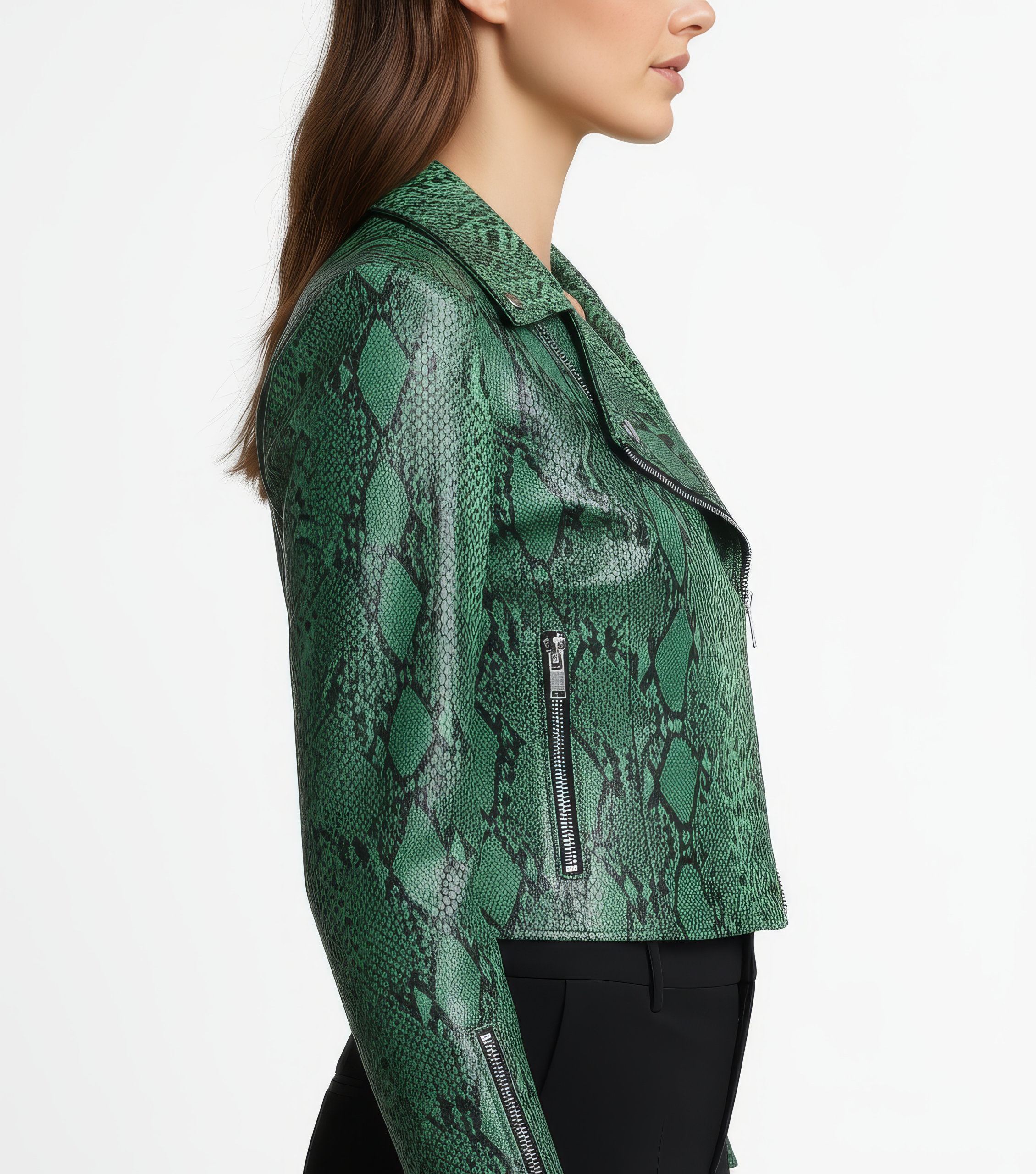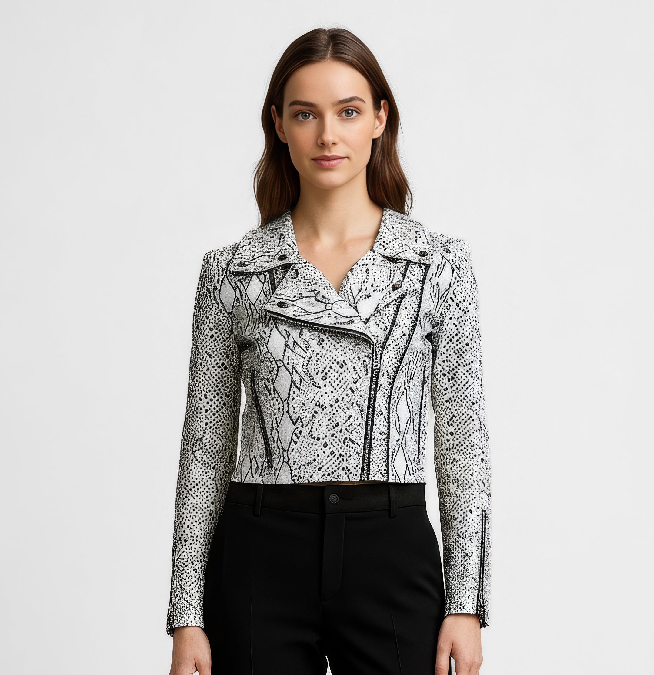 Dress down with denim and boots or elevate with wide-leg trousers and heels; snake-embossed finish adds instant edge.