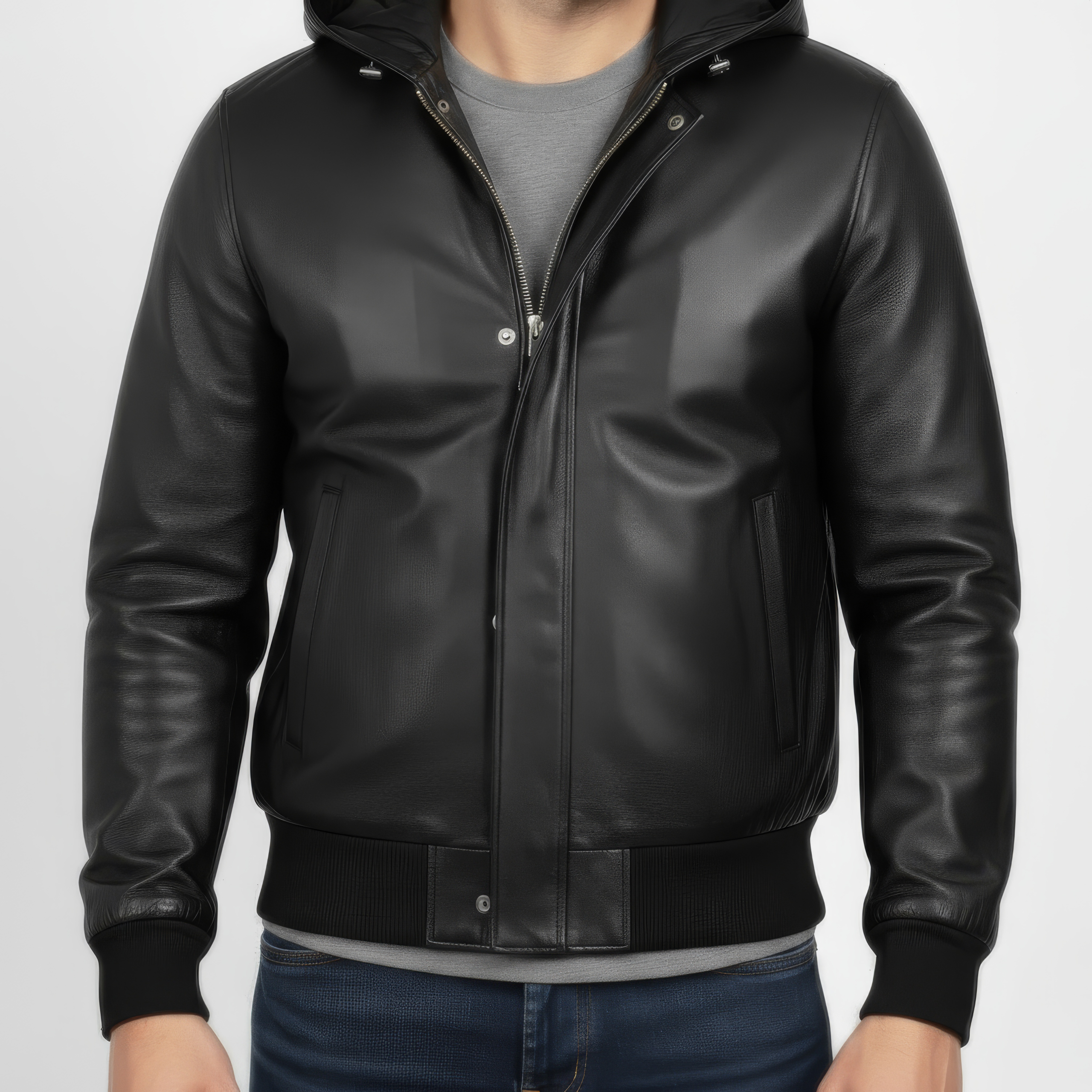 Men’s Real Leather Hooded Bomber Jacket