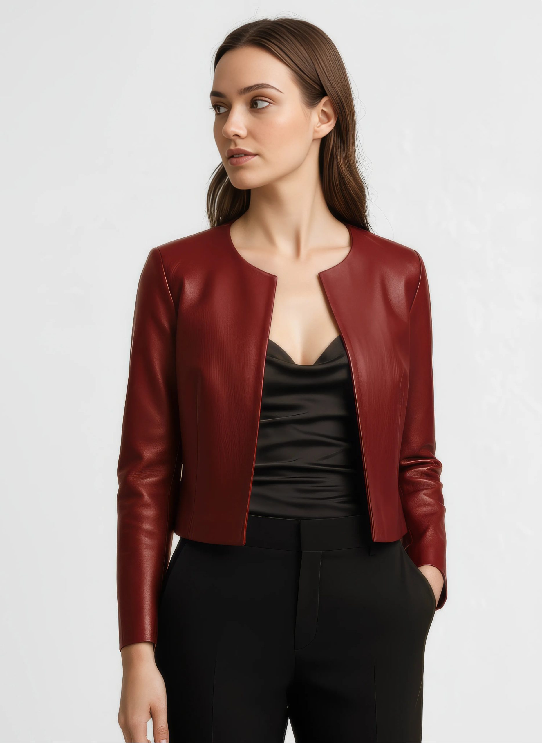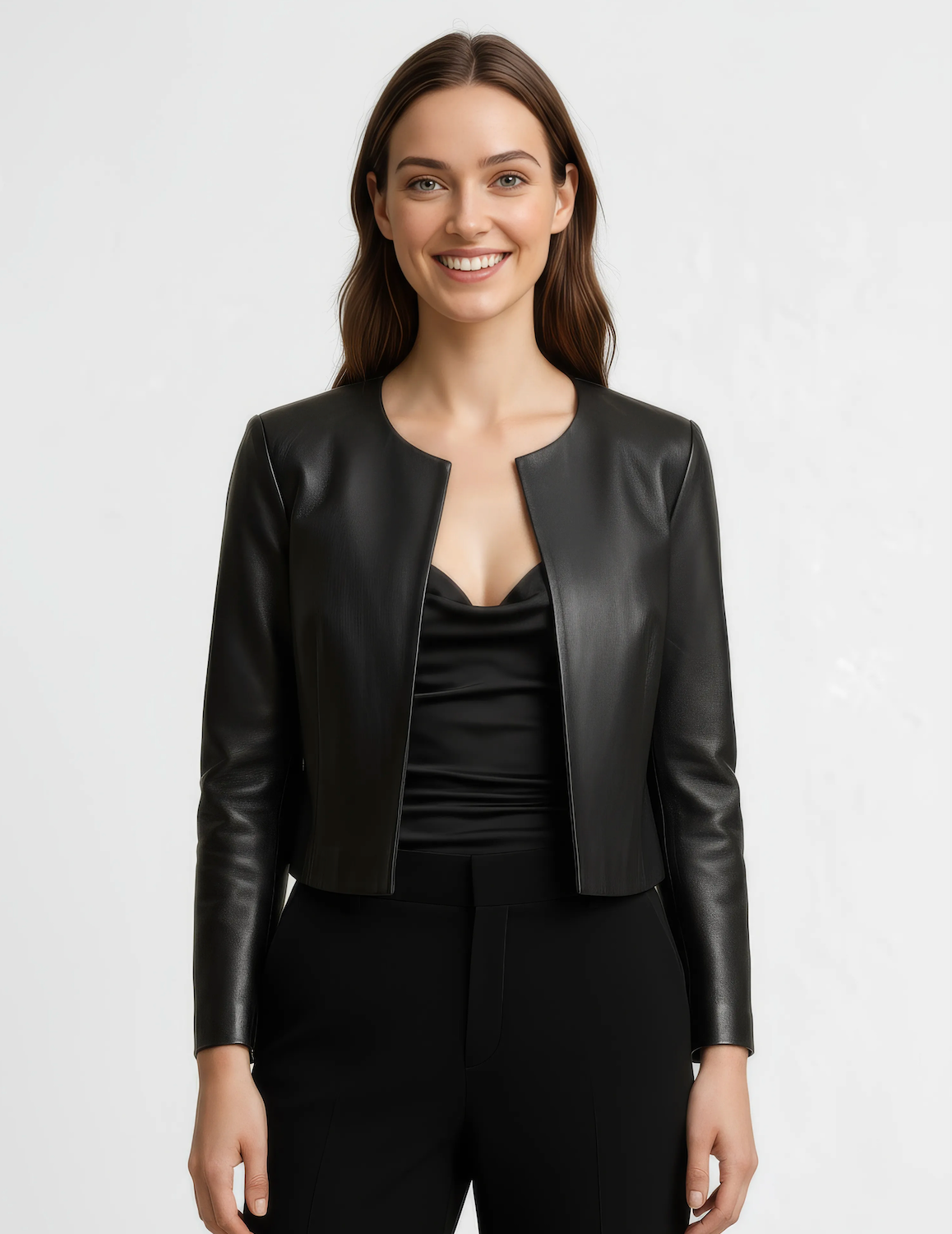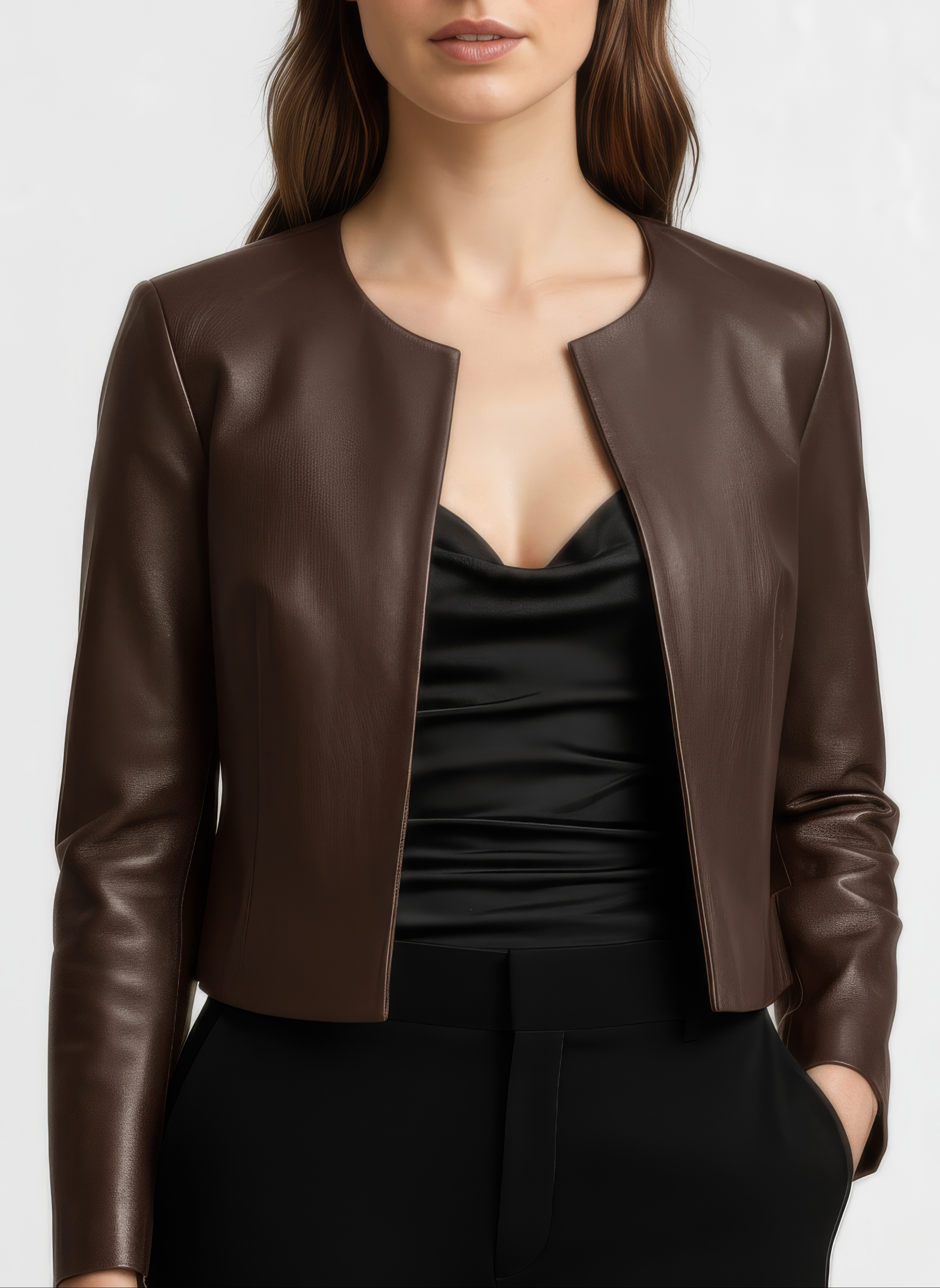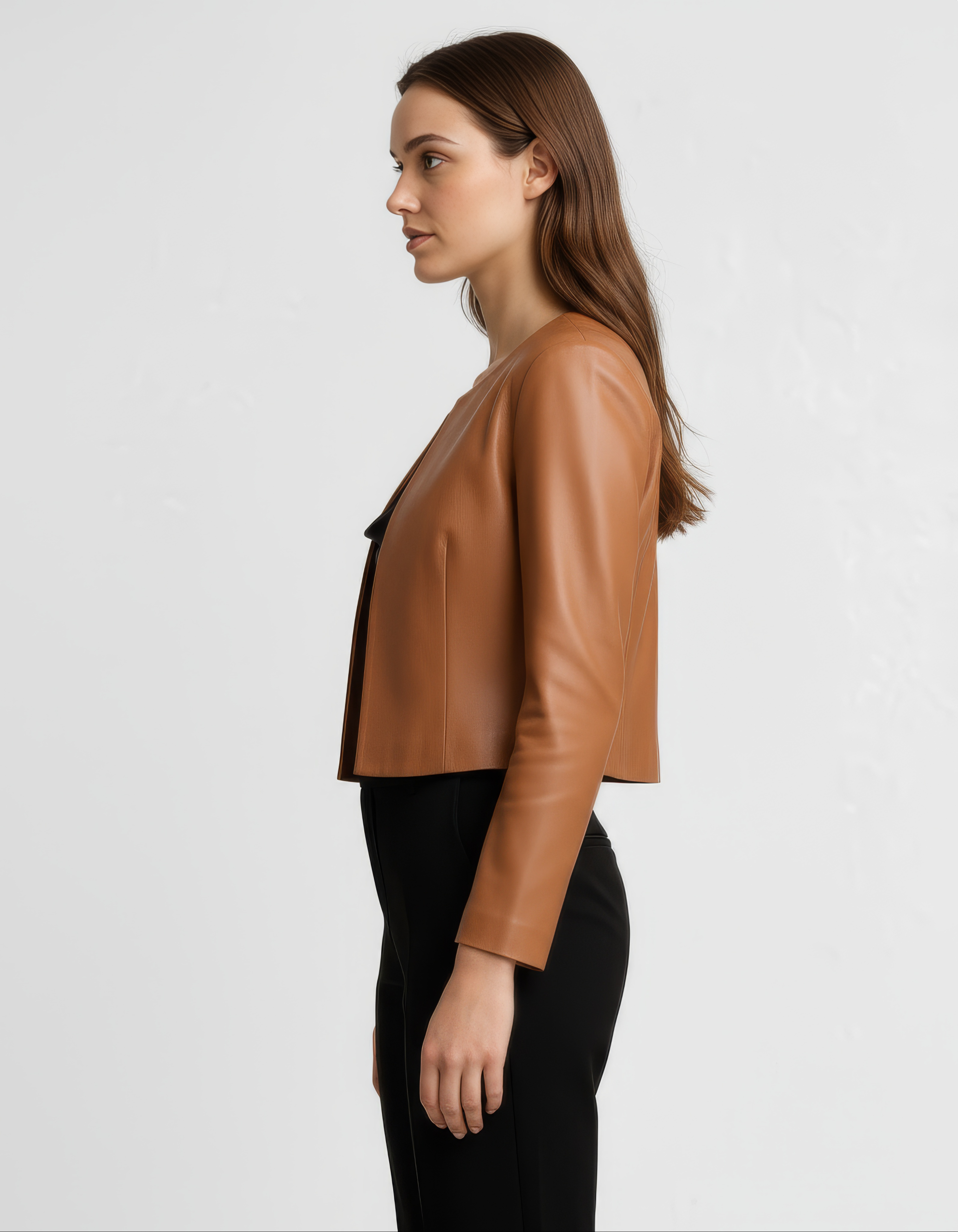 A study in minimalist tailoring, this open-front, collarless jacket is cut to a clean cropped silhouette with a soft round neckline and perfectly balanced proportions. Crafted from full-grain leather selected from the top 5% worldwide for a refined hand and lasting durability.