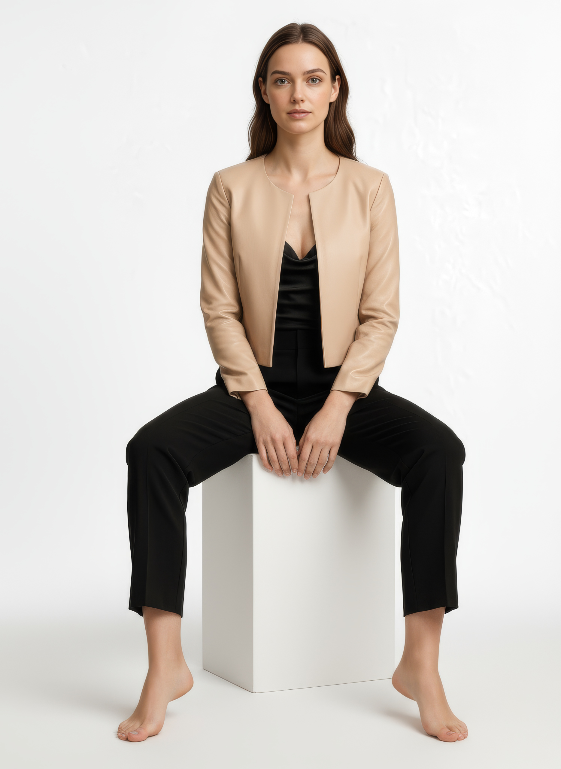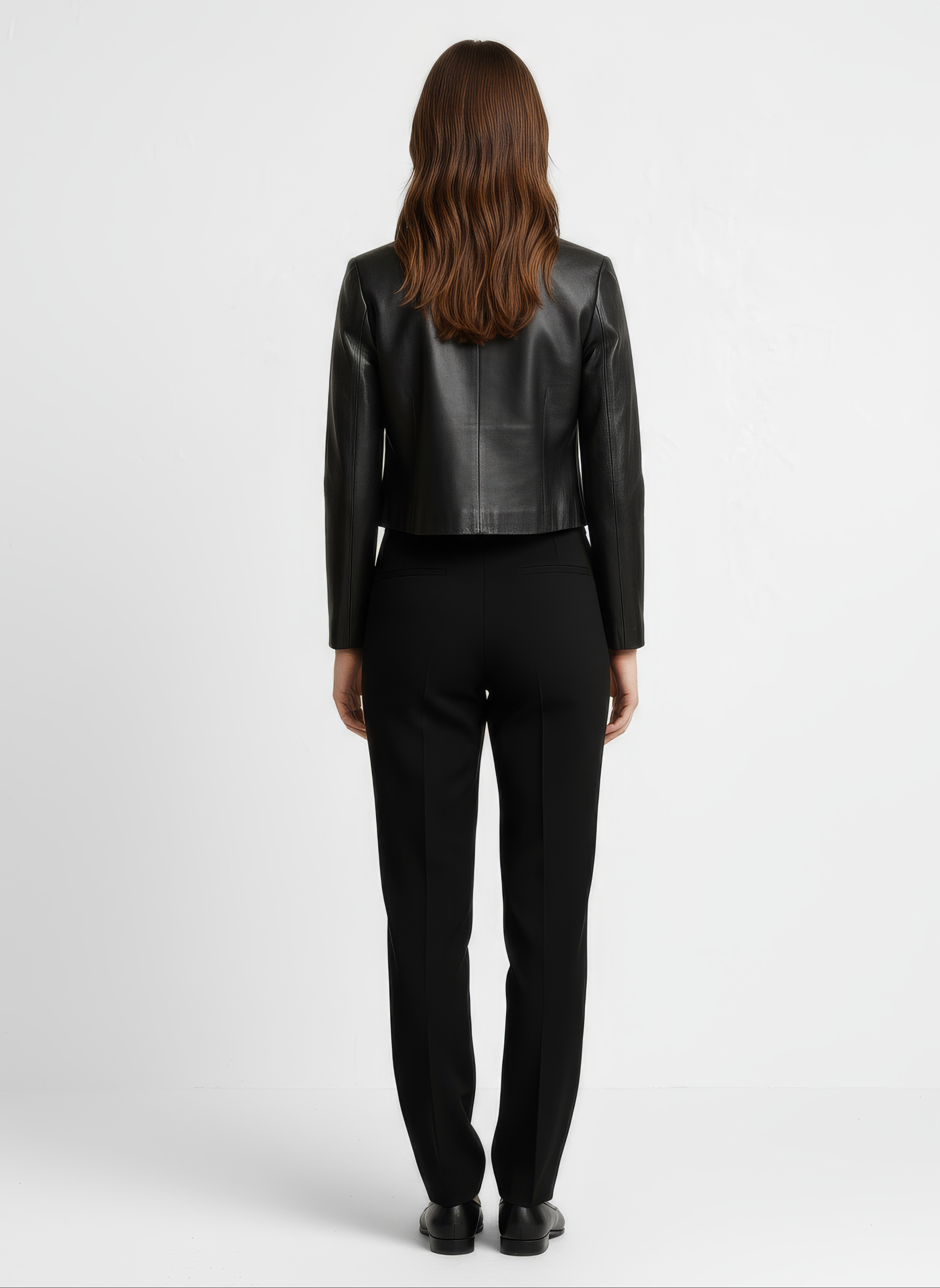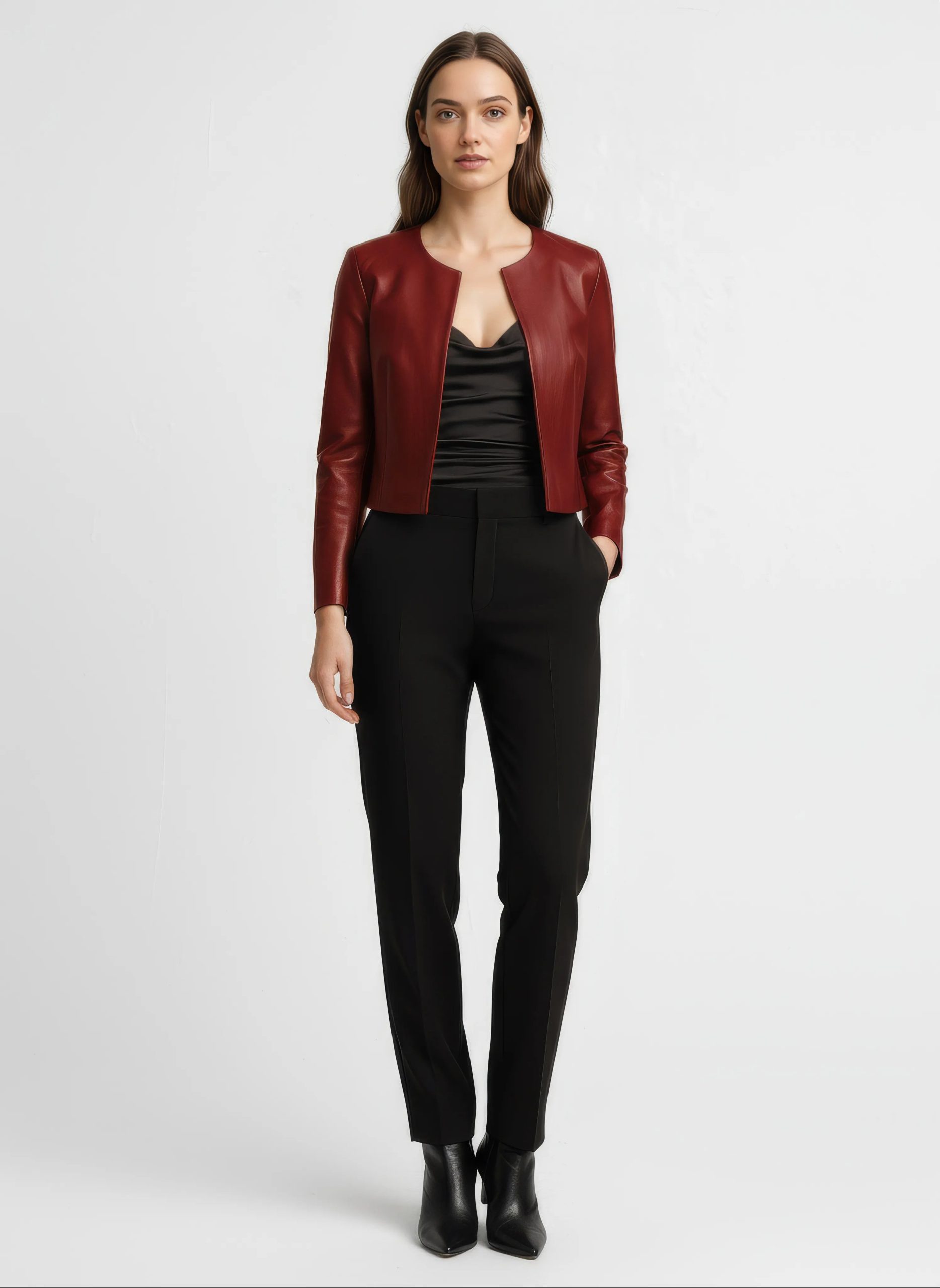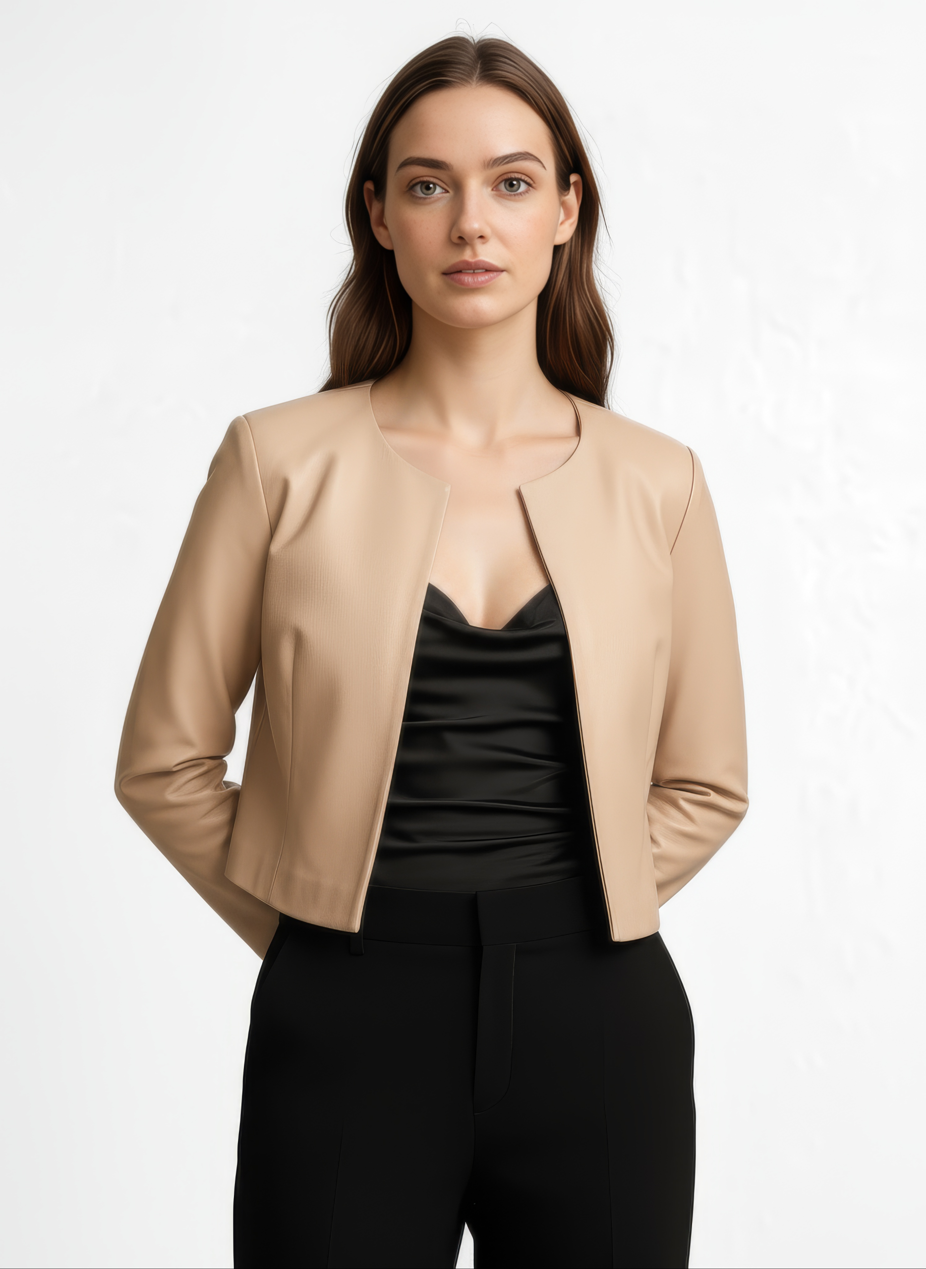 A study in minimalist tailoring, this open-front, collarless jacket is cut to a clean cropped silhouette with a soft round neckline and perfectly balanced proportions. Crafted from full-grain leather selected from the top 5% worldwide for a refined hand and lasting durability.