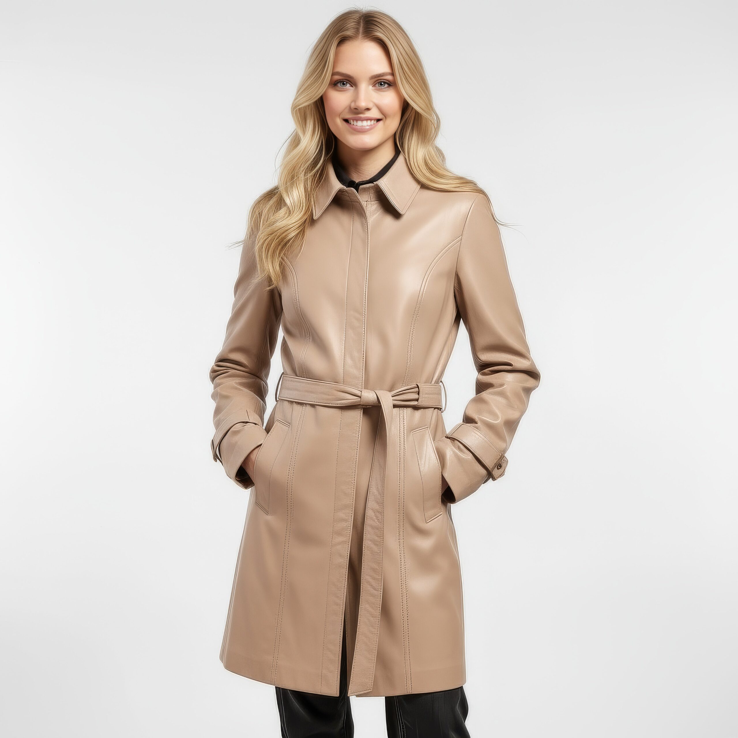 A refined, knee-length trench in buttery lambskin, designed by Lidiane Ruiz. Clean lines, a concealed front, and a self-tie belt create a sleek, waist-defined silhouette that transitions effortlessly from weekday to weekend.