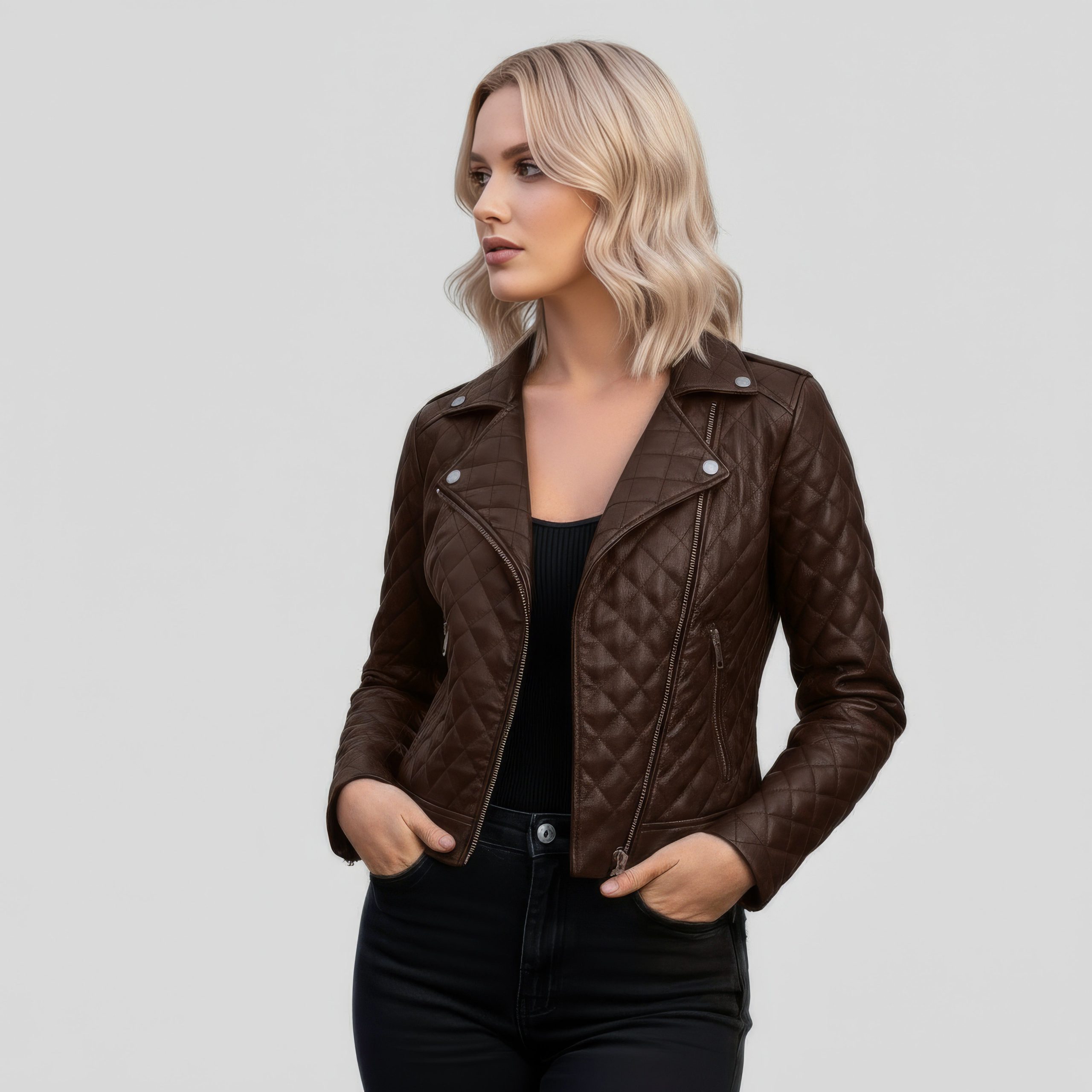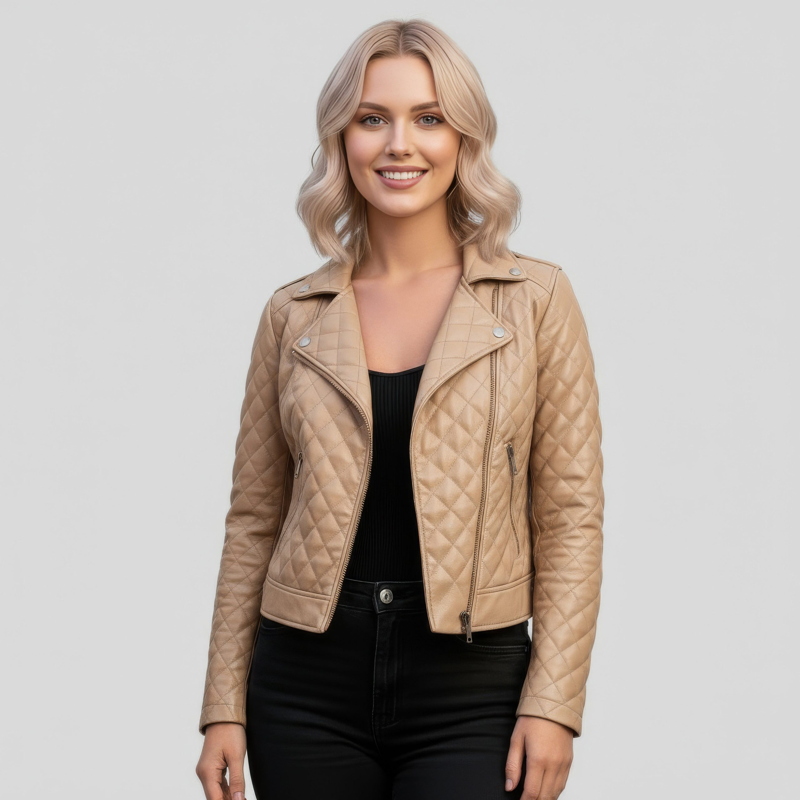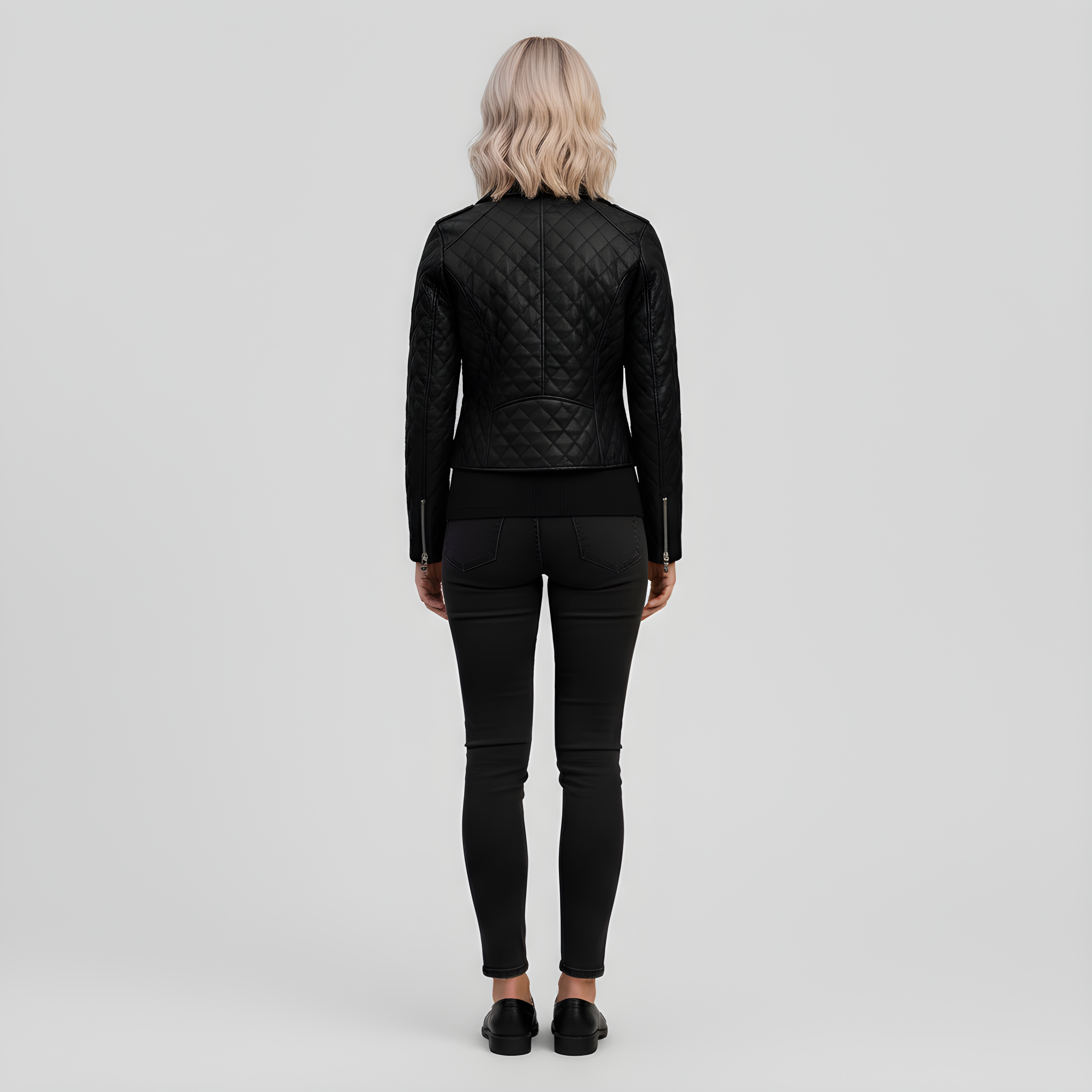 A modern, diamond-quilted biker that balances structure with softness. Clean moto lapels, a sculpted waist, and sleek zip hardware create a polished silhouette that moves effortlessly from day to night.