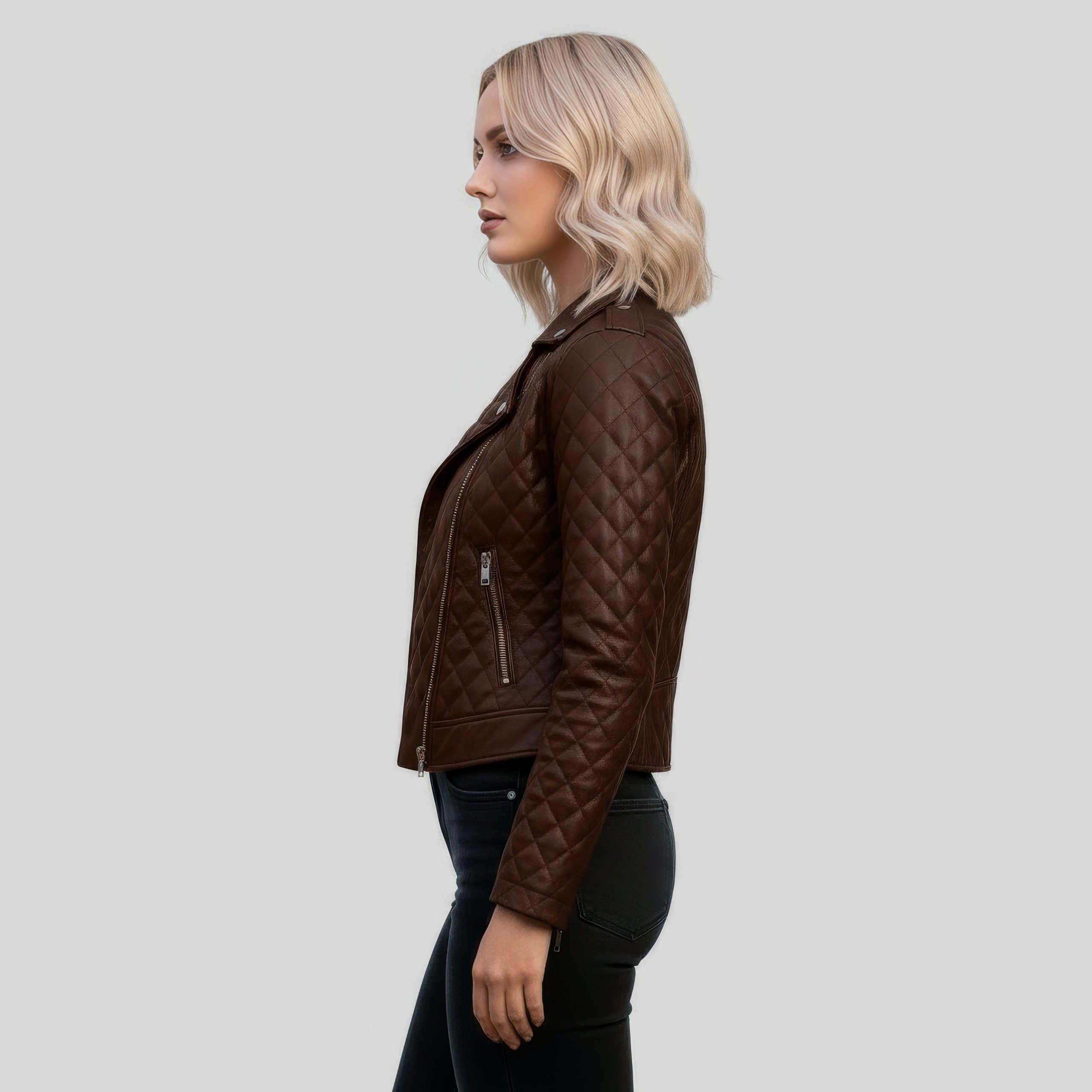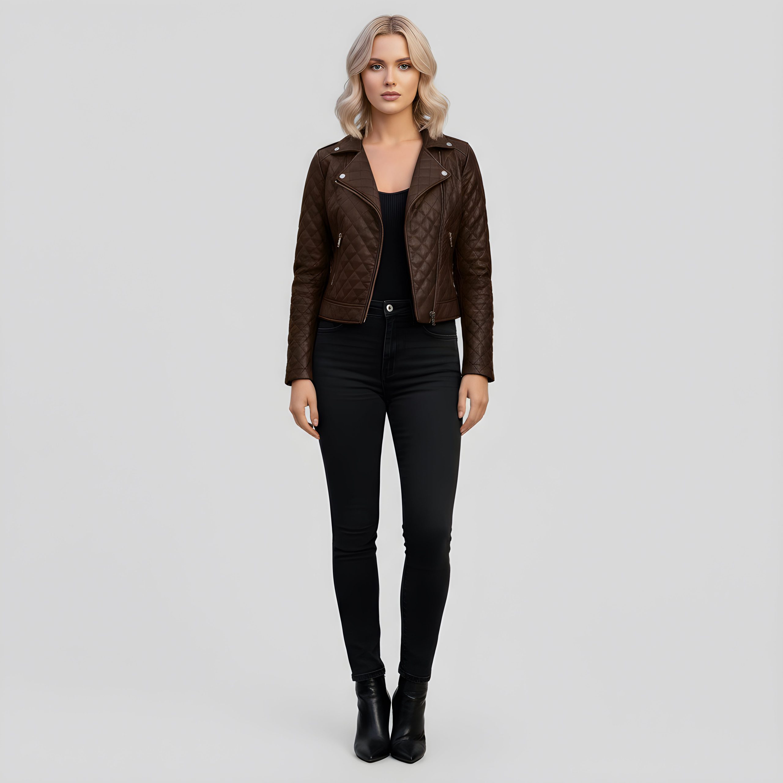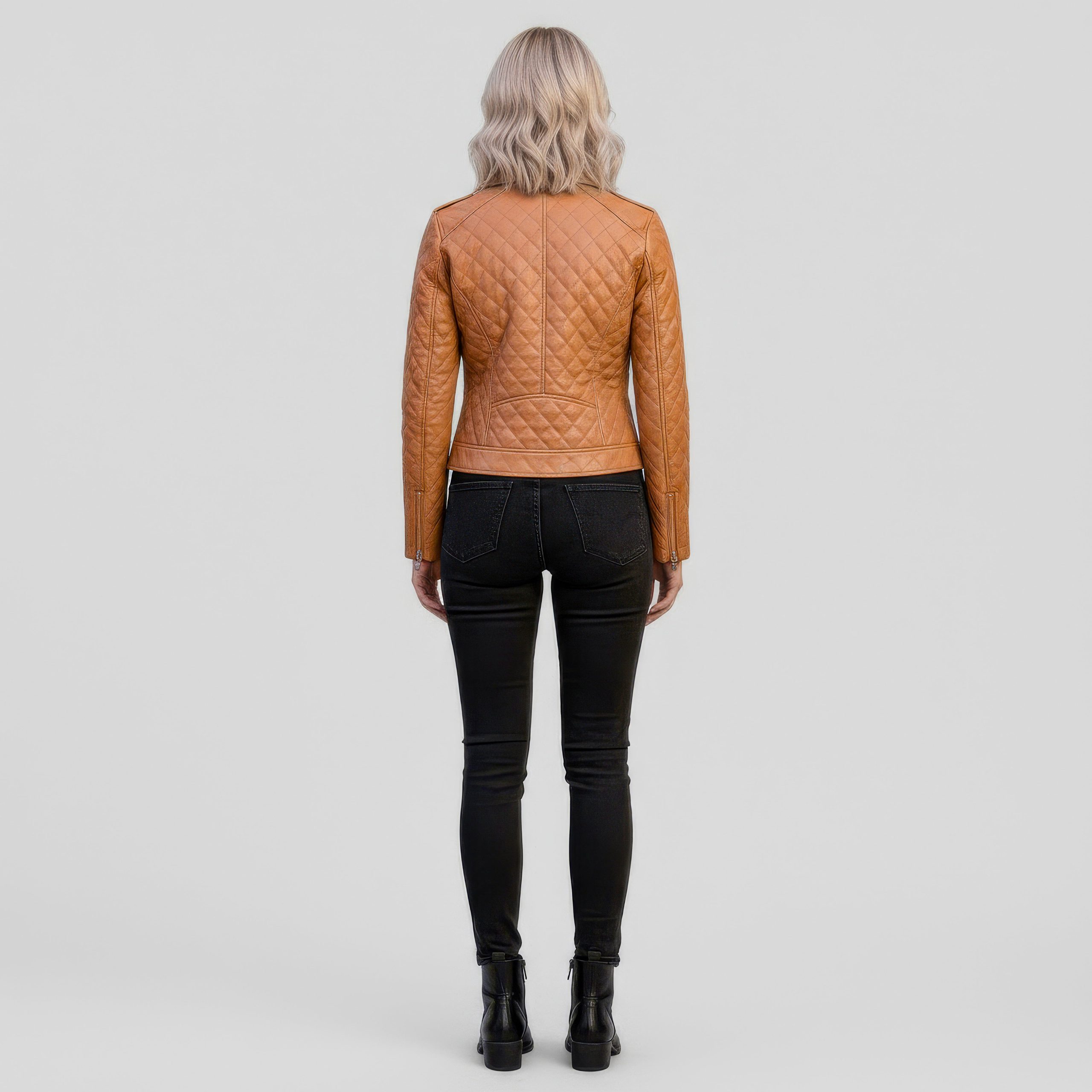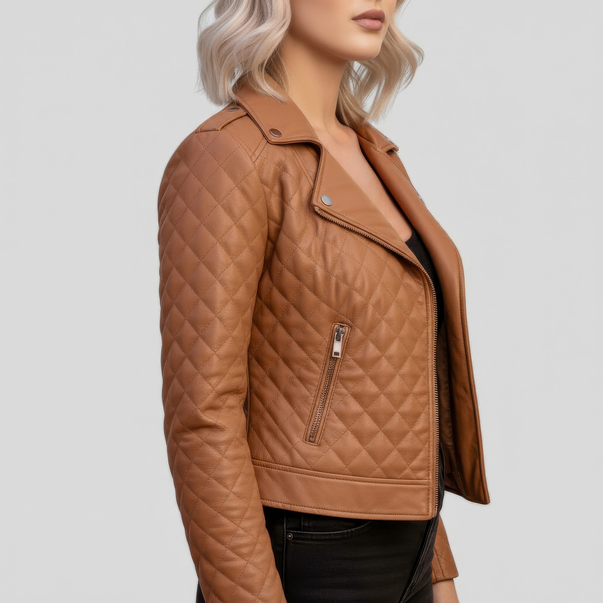 A modern, diamond-quilted biker that balances structure with softness. Clean moto lapels, a sculpted waist, and sleek zip hardware create a polished silhouette that moves effortlessly from day to night.