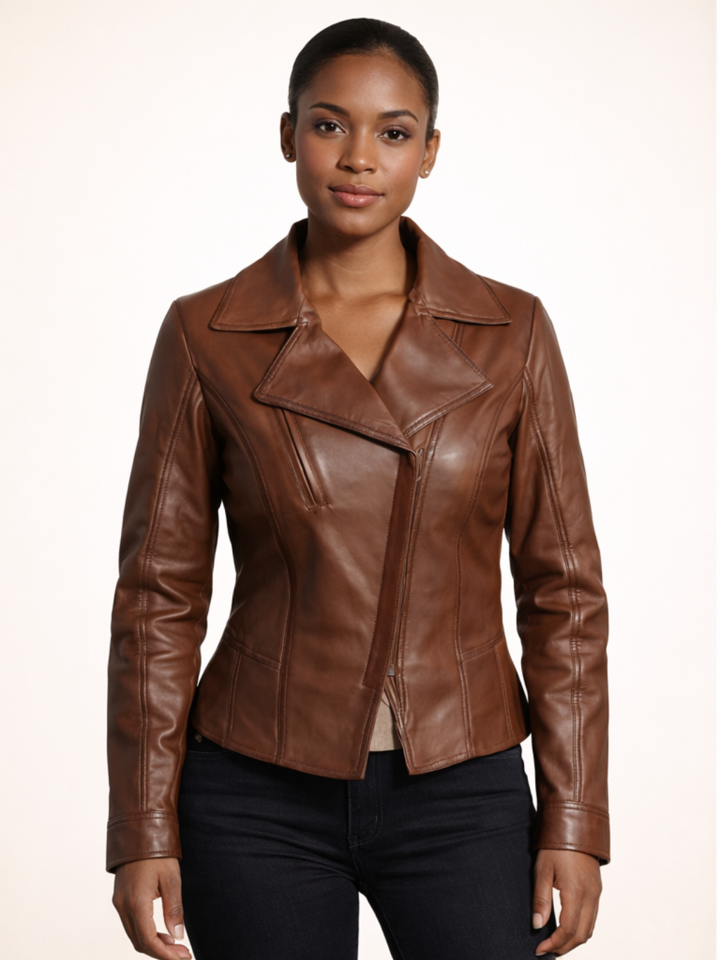Ideal for women seeking a stylish yet versatile brown leather jacket, this piece blends craftsmanship, modern design, and everyday wearability.