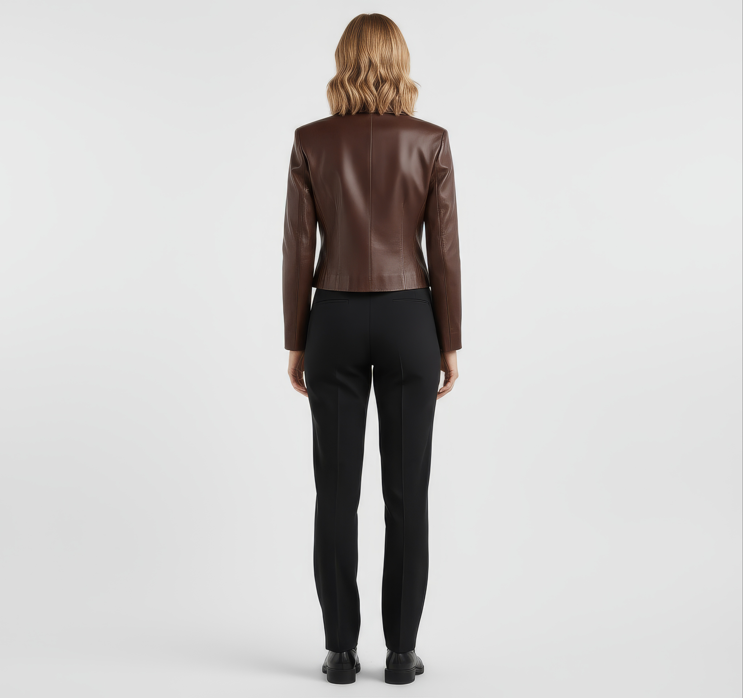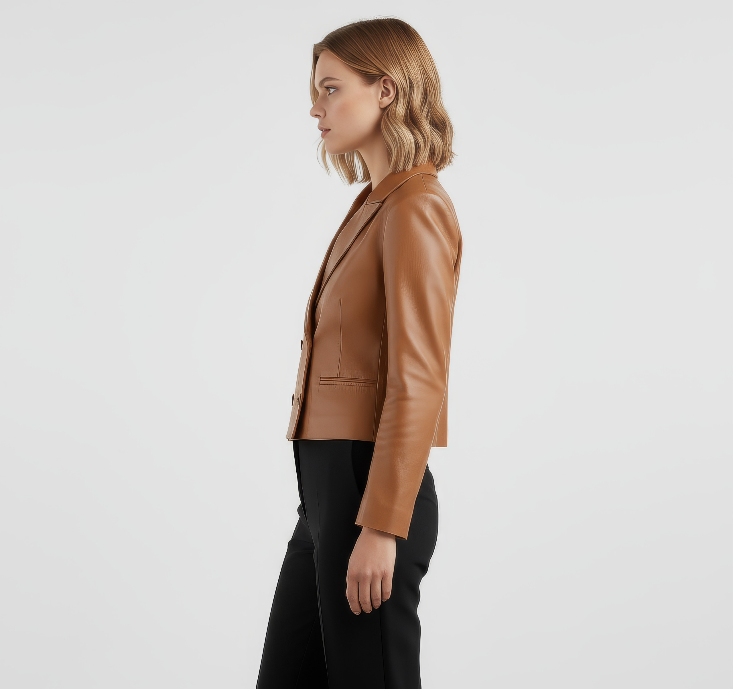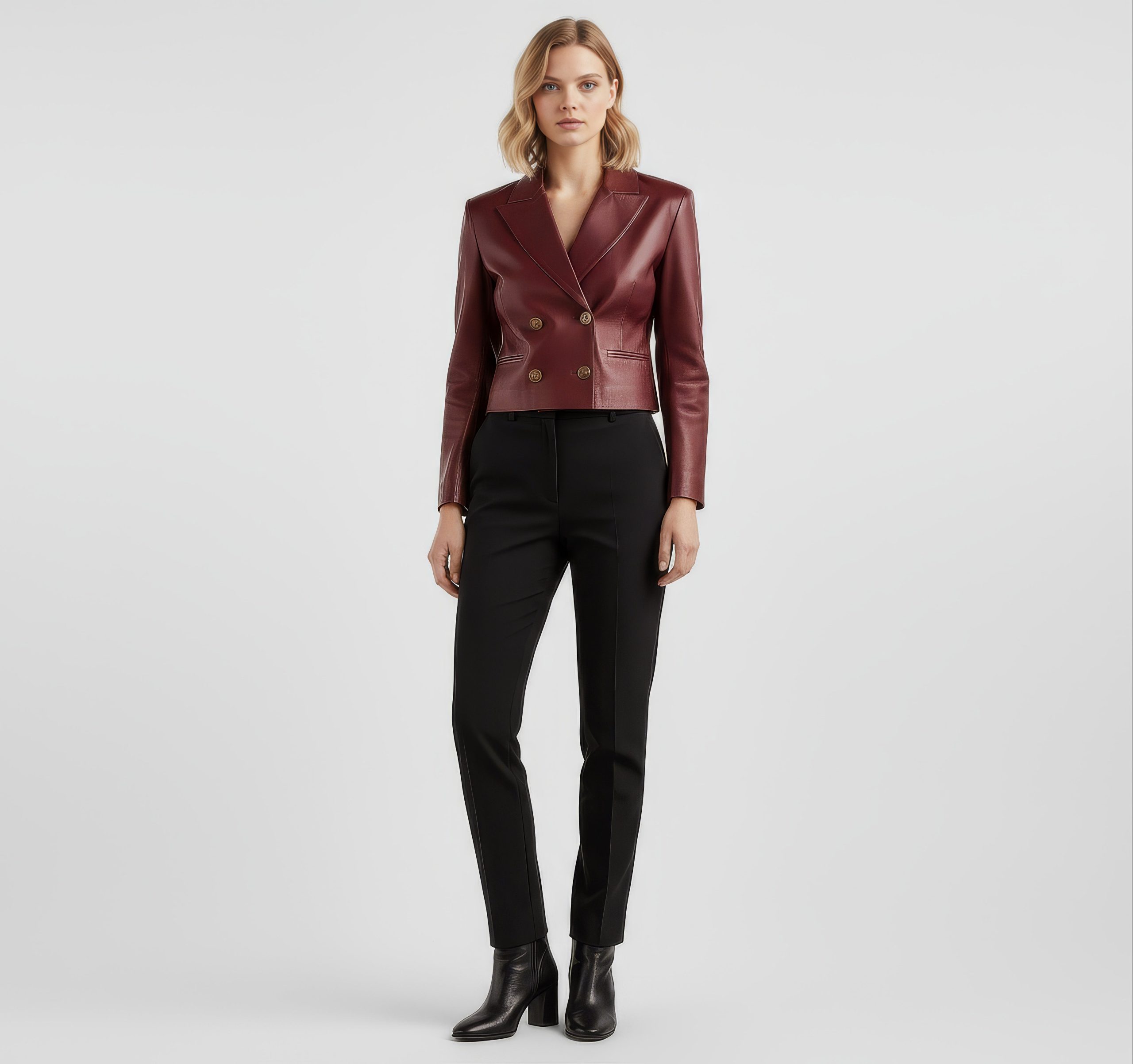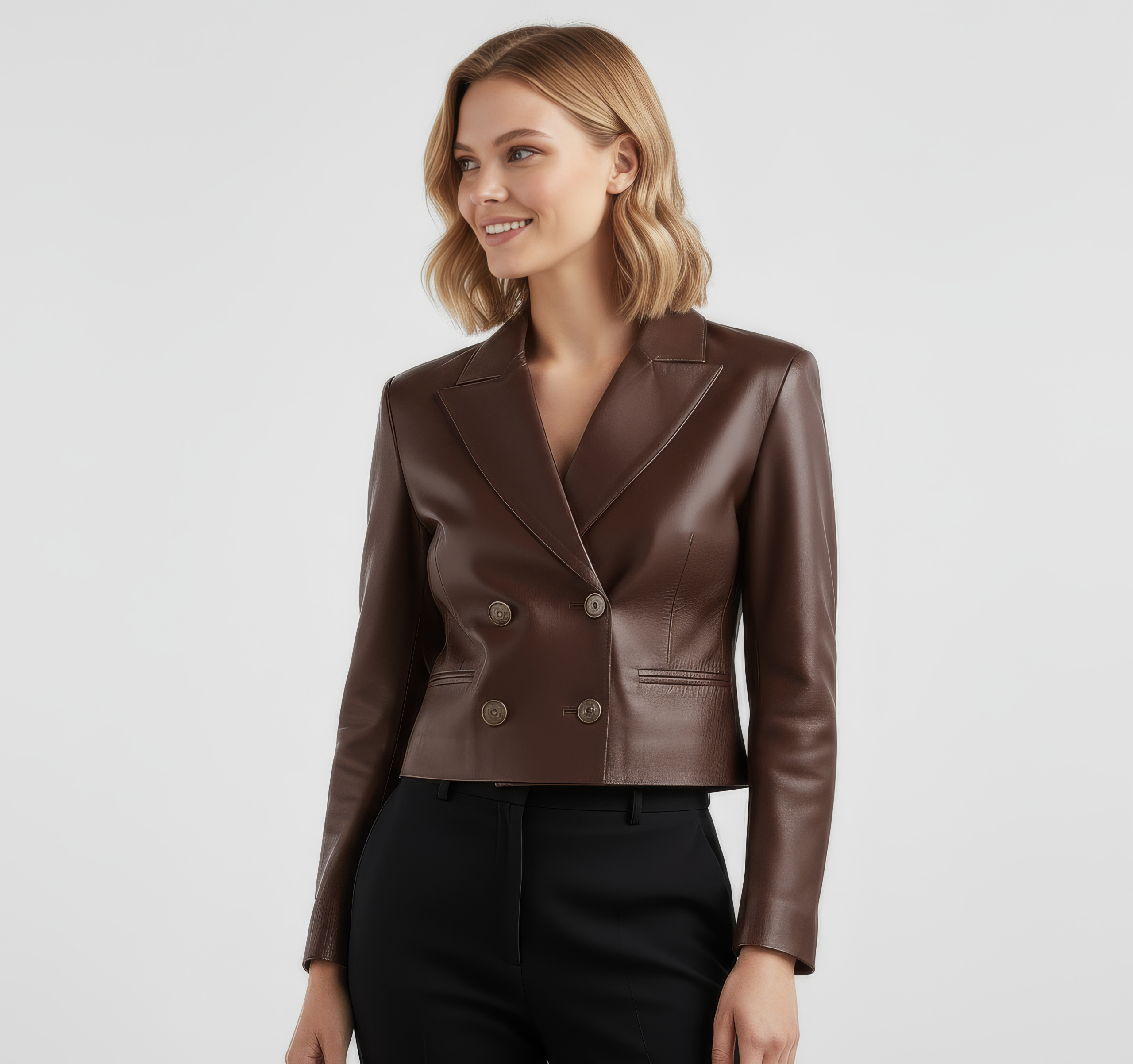 A sharp, cropped leather blazer with modern tailoring and just-right structure. The double-breasted front and clean welt pockets give it a polished, dress-up or dress-down versatility.