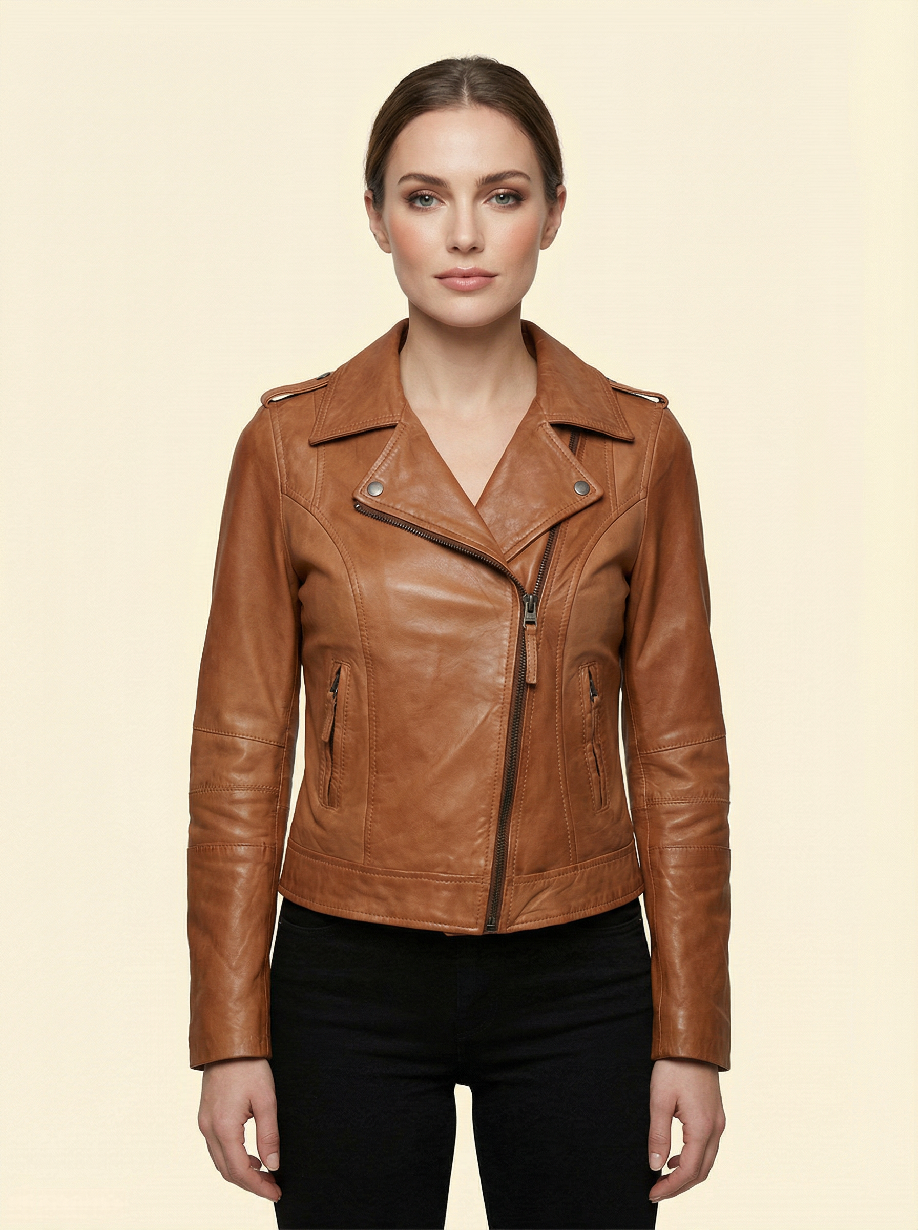 This semi-notched lapel biker ladies' jacket is designed for riders who value durability, comfort, and timeless style. Made from drum-dyed genuine cowhide leather (1.1–1.2 mm thickness), the jacket offers excellent abrasion resistance with a smooth, premium finish.