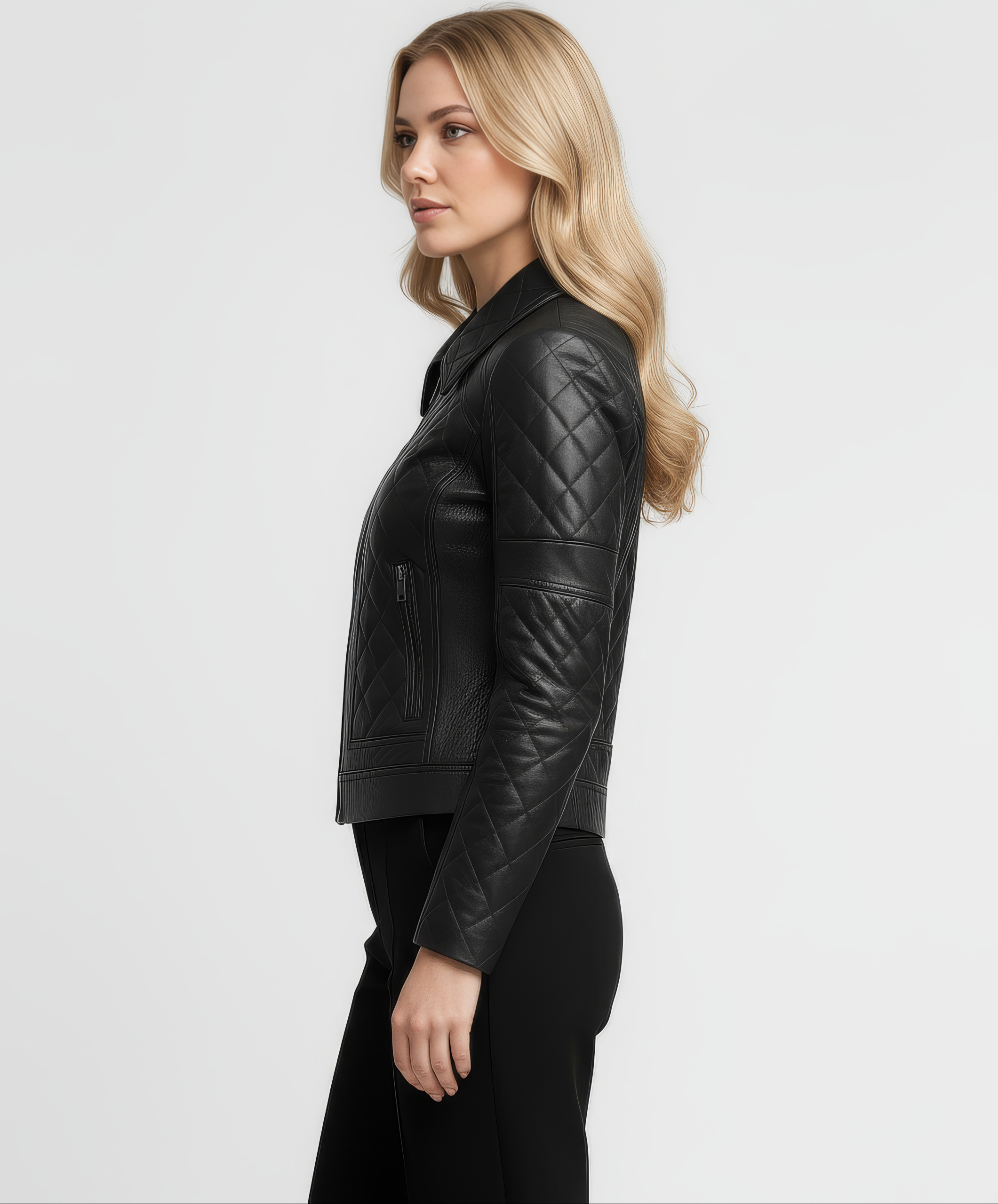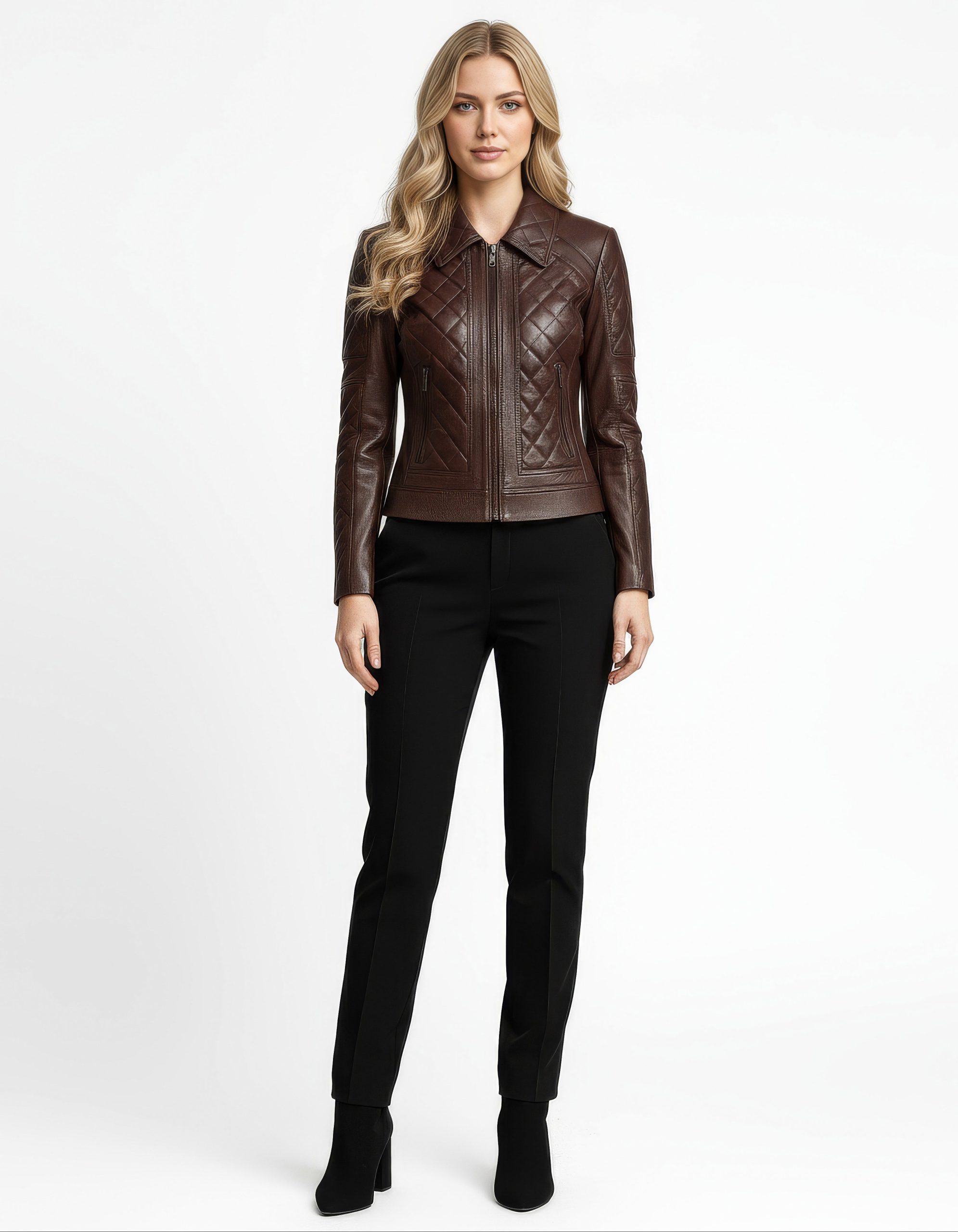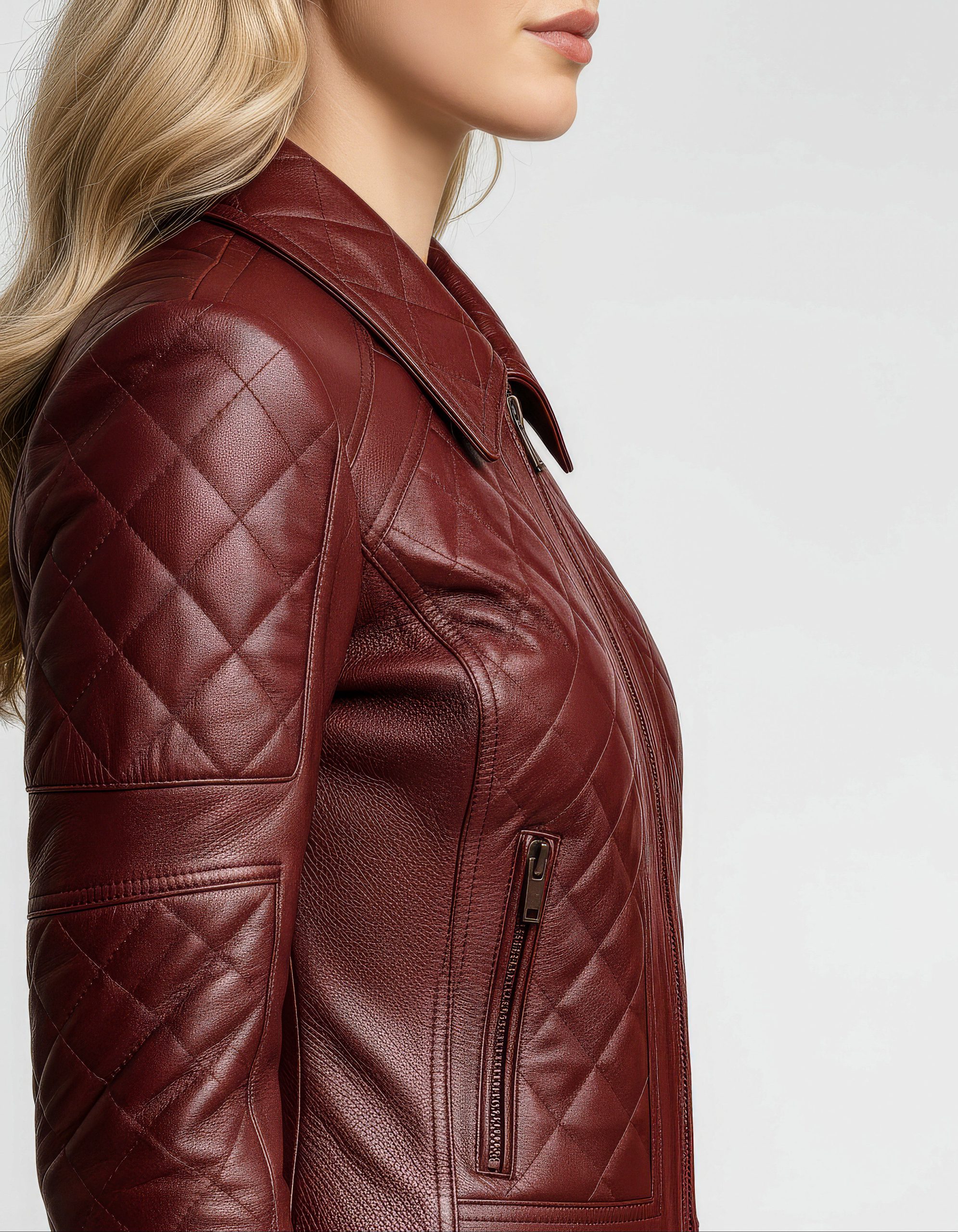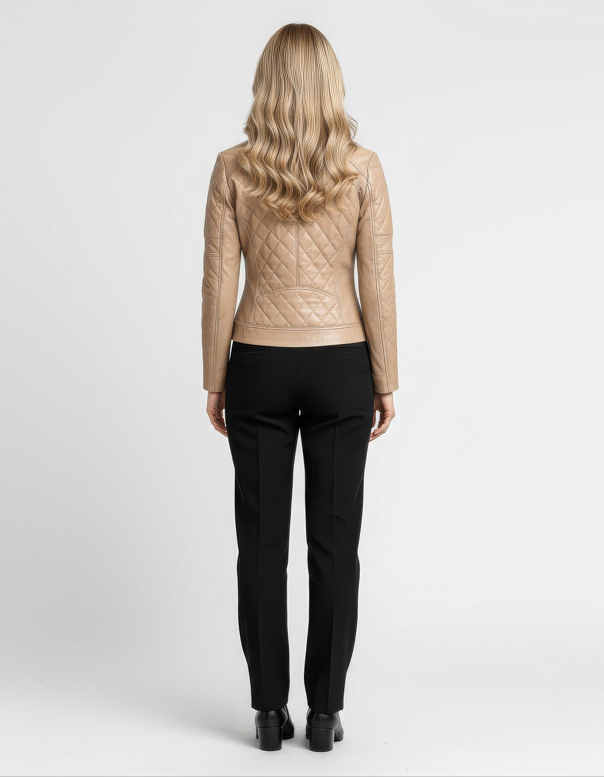 Crafted from full-grain lambskin, the top 5% leather selection worldwide. This fitted quilted jacket delivers quiet luxury with clean lines and precise tailoring. The point collar and zip-front keep the silhouette sleek from day to night.