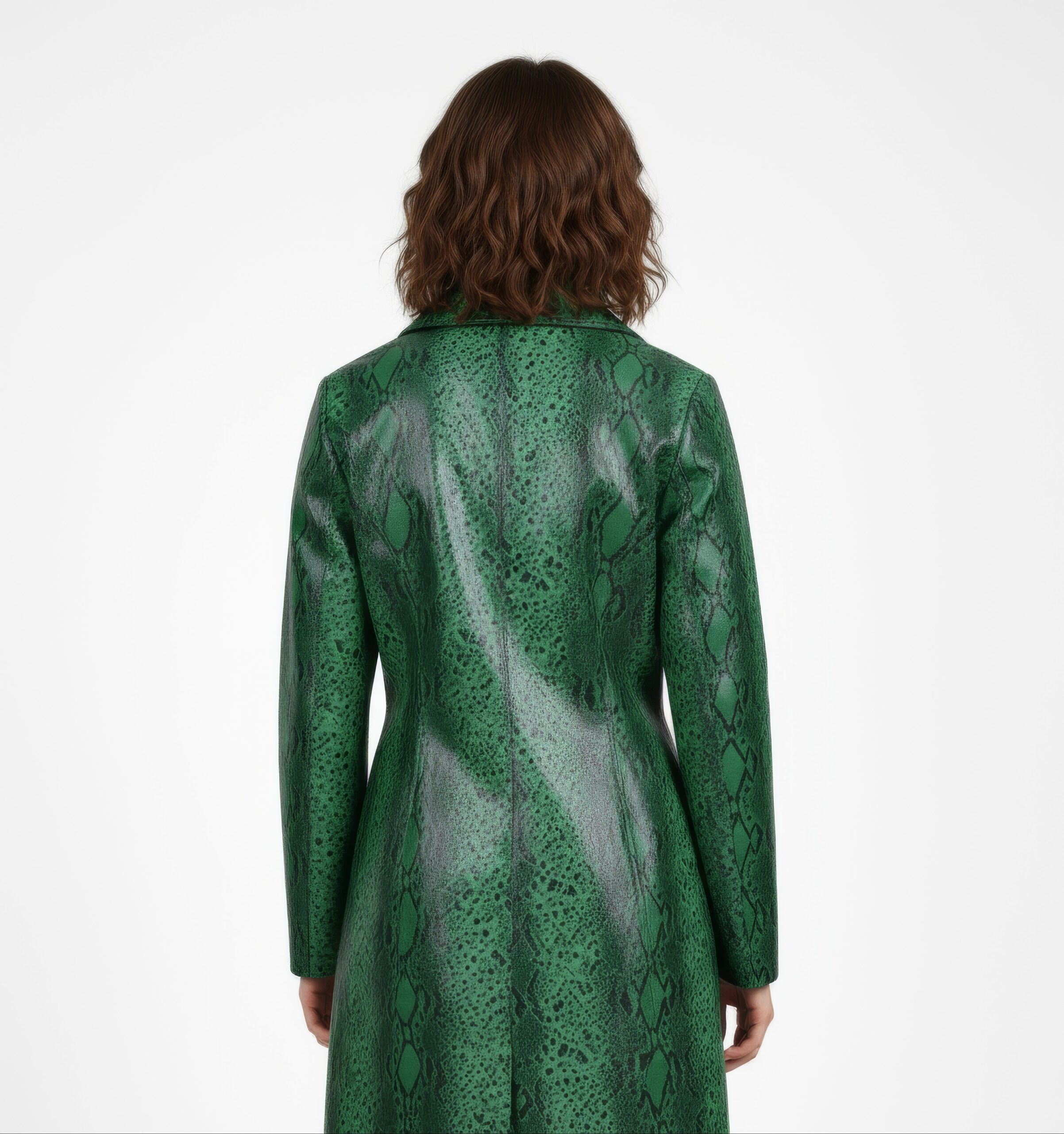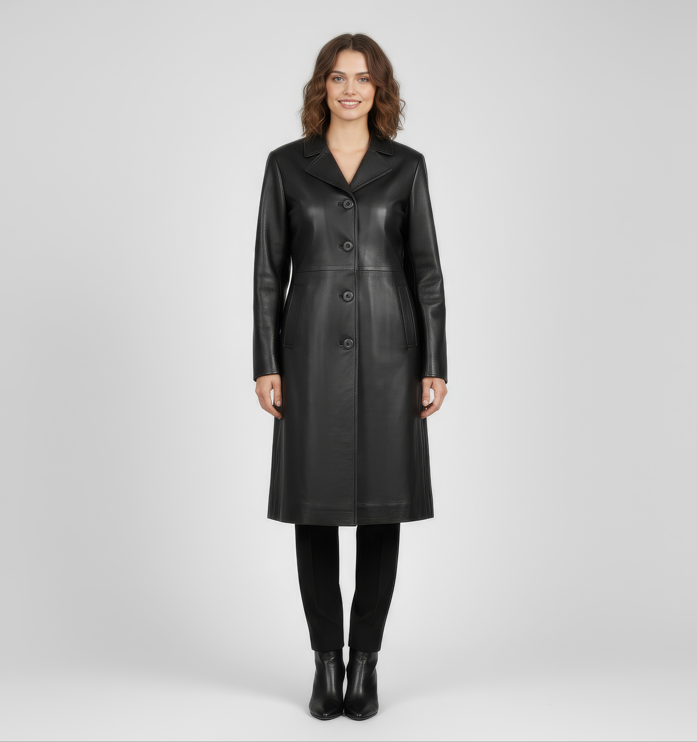 A refined, knee-length trench in buttery lambskin, designed by Lidiane Ruiz. Clean lines, a concealed front, and a self-tie belt create a sleek, waist-defined silhouette that transitions effortlessly from weekday to weekend.